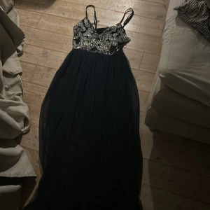 Jätte fin balklänning. Passar mig som är lite bredare runt bröstet och har lite större bröst. Jag är 1,73 och är perfekt i längden. Den täcker fötterna för mig. Marin blå med paljetter och använd 1 gång