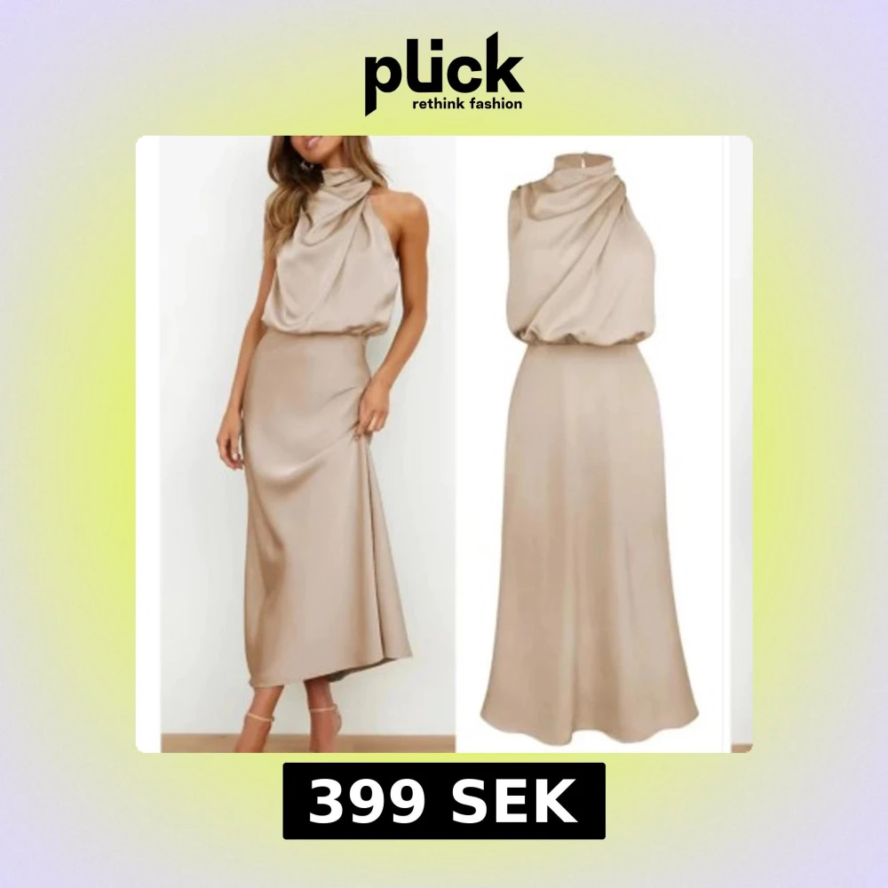Elegant långklänning i champagnefärgat satinmaterial med draperad, hög hals och ärmlös design. Klänningen har en figurnära passform upptill och faller snyggt längs kroppen. Perfekt för speciella tillfällen. Helt ny! Ej använd.