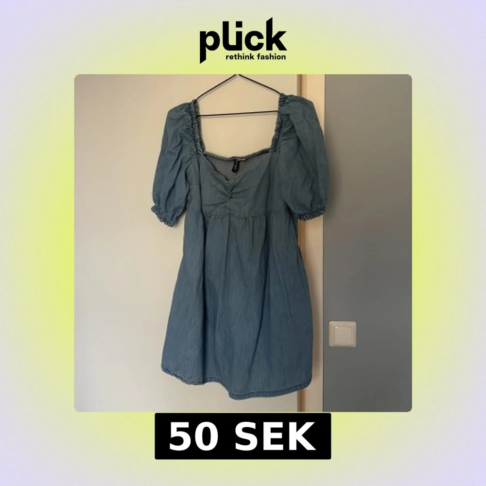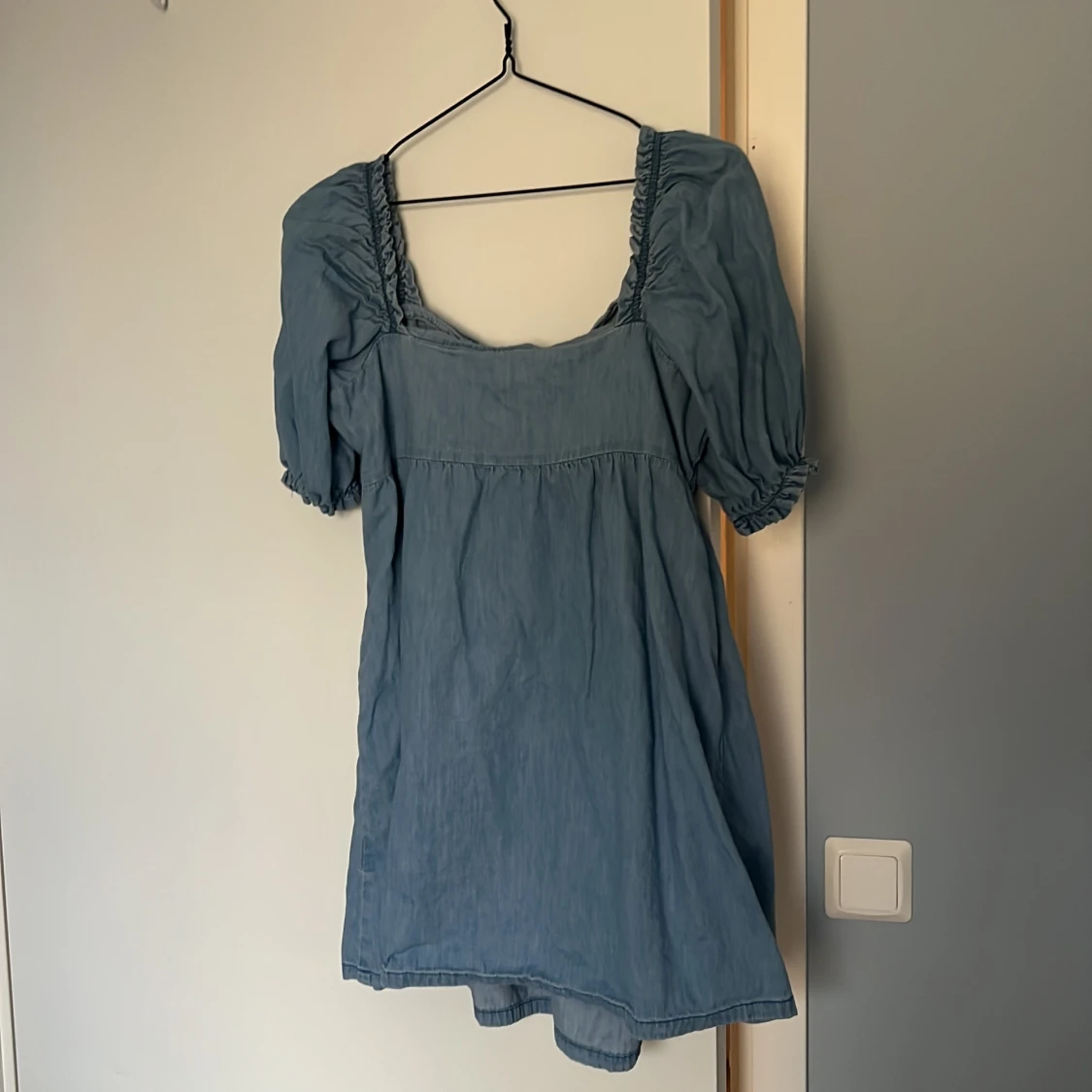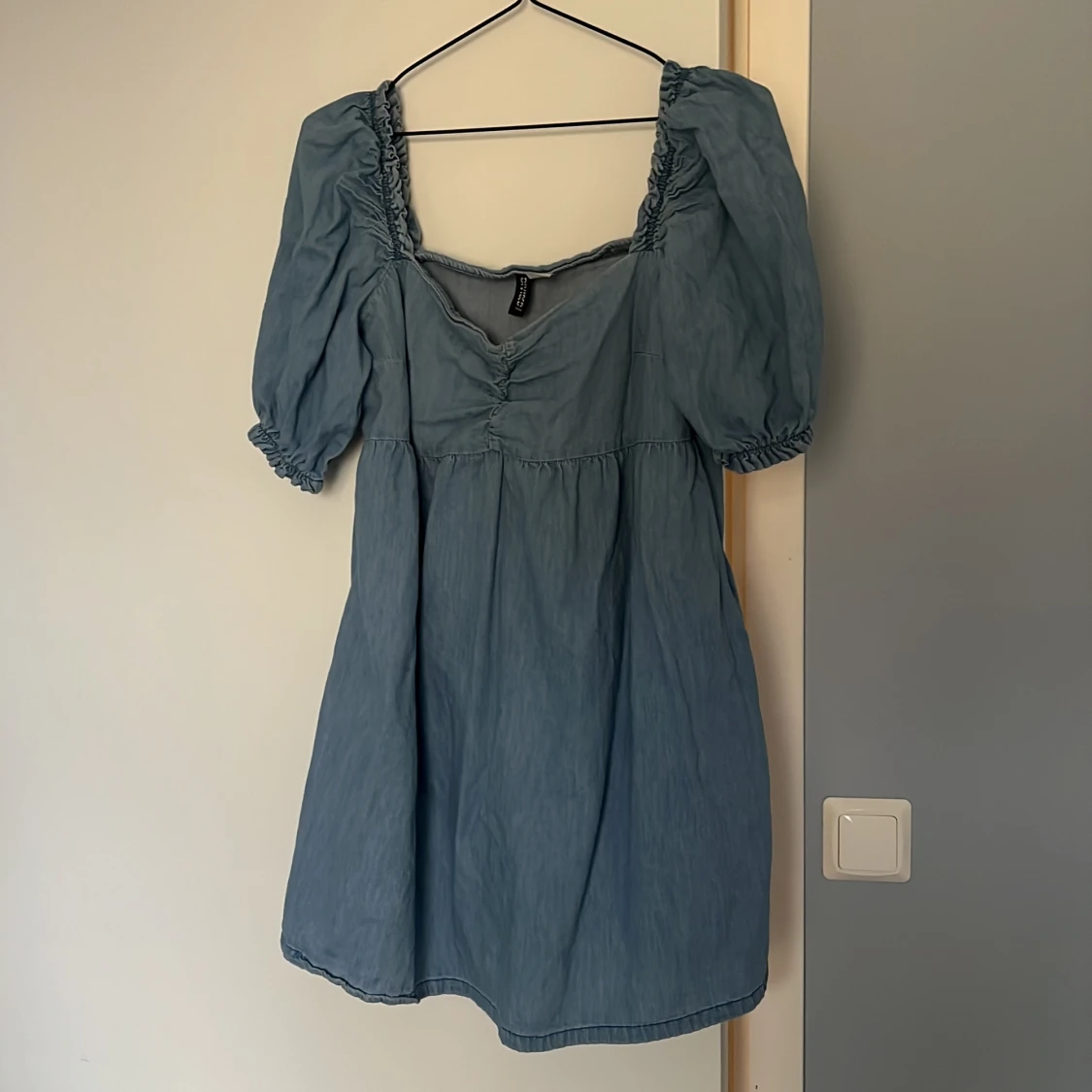 Supersöt blå klänning från H&M Divided i storlek L. Modellen har puffiga korta ärmar, rynkade detaljer vid axlarna och en smickrande fyrkantig urringning. Tillverkad i mjukt bomullstyg som känns lätt och skönt mot huden. Perfekt för varma dagar!