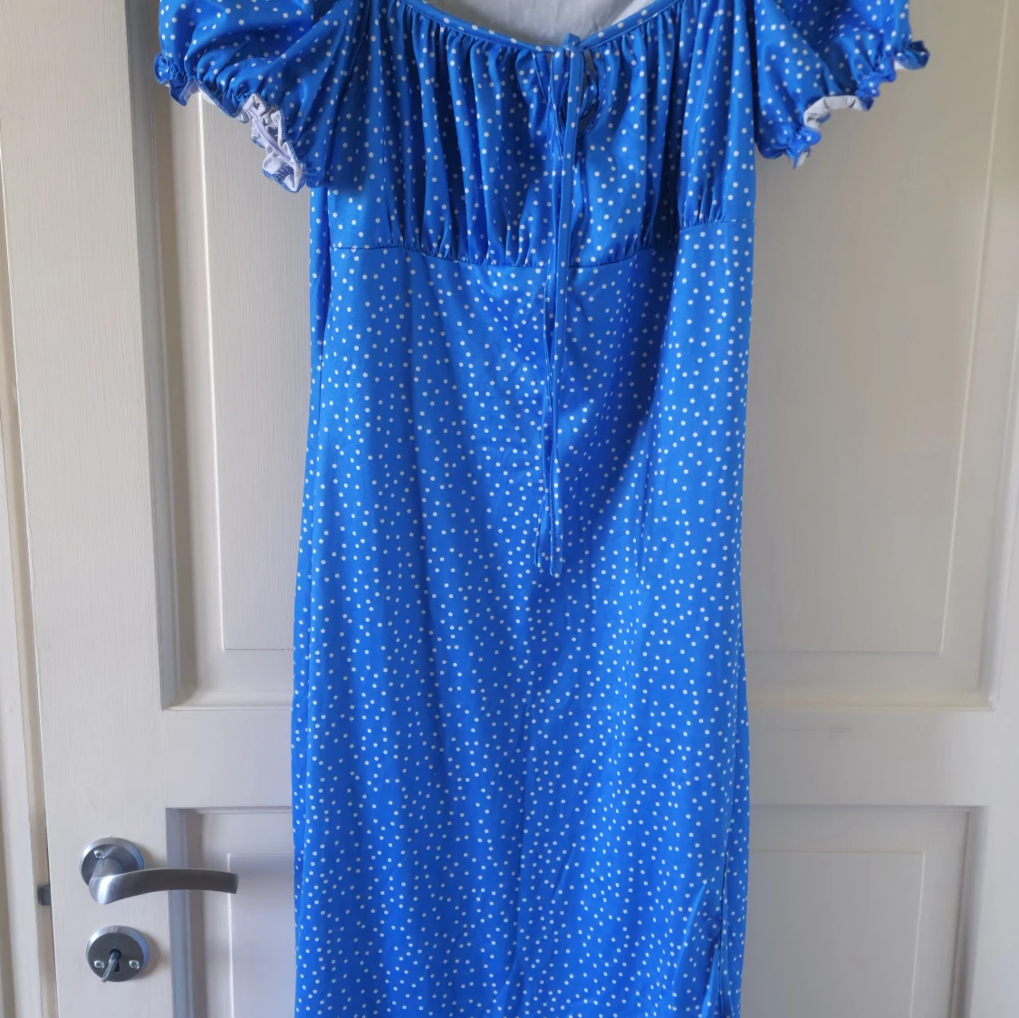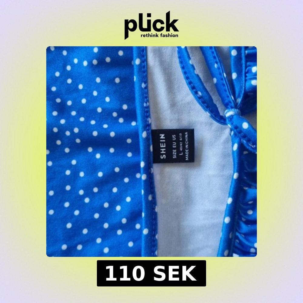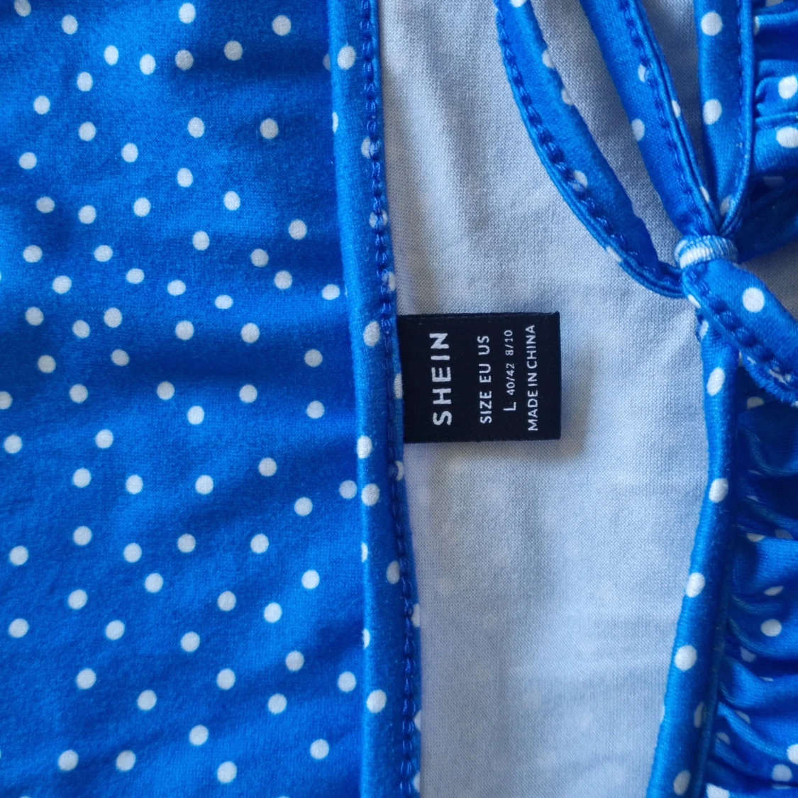 Säljer en blå klänning från SHEIN med vita prickar och korta puffärmar. Klänningen har en söt knytning upptill och en rak passform som faller fint. Perfekt för sommarens alla tillfällen!