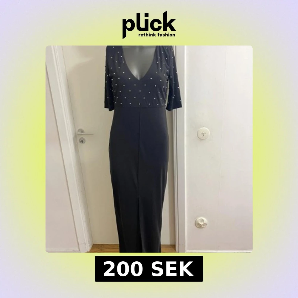 Elegant svart långklänning med djup v-ringning och pärldetaljer på överdelen. Klänningen har trekvartsärm och en snygg öppen rygg. Rak passform med slits framtill för extra edge. Perfekt för dig som vill sticka ut med stilren glamour.