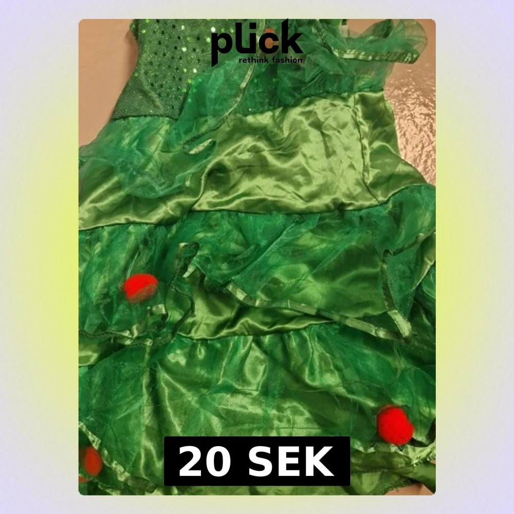 Unik grön klänning med flera lager glansigt tyg och volanger, dekorerad med röda bollar och paljetter upptill. Klänningen har en festlig look som påminner om en julgran och är tillverkad i syntetmaterial med transparenta detaljer. Ingen hatt ingår. För små barn one size