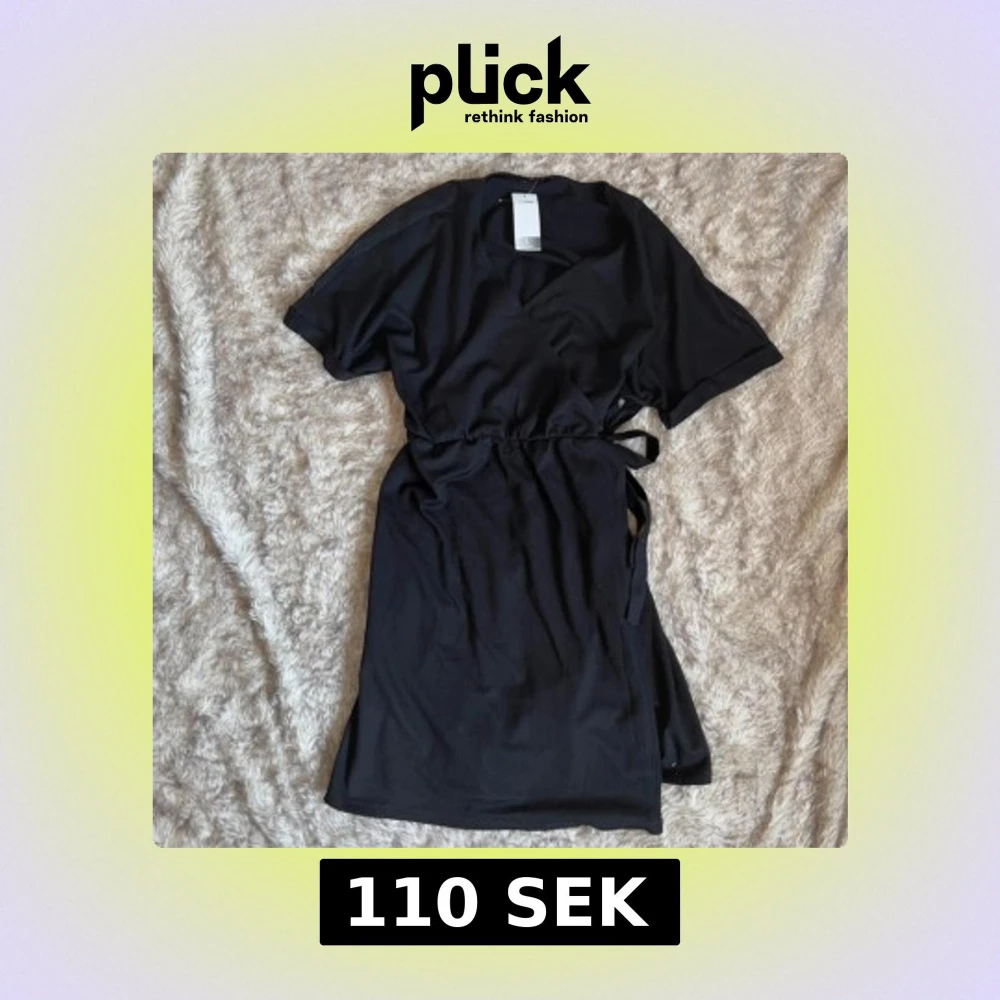 Svart omlottklänning i storlek L. Klänningen har korta ärmar, justerbara knytband i midjan och en v-ringad omlottfront. Ny med prislapp