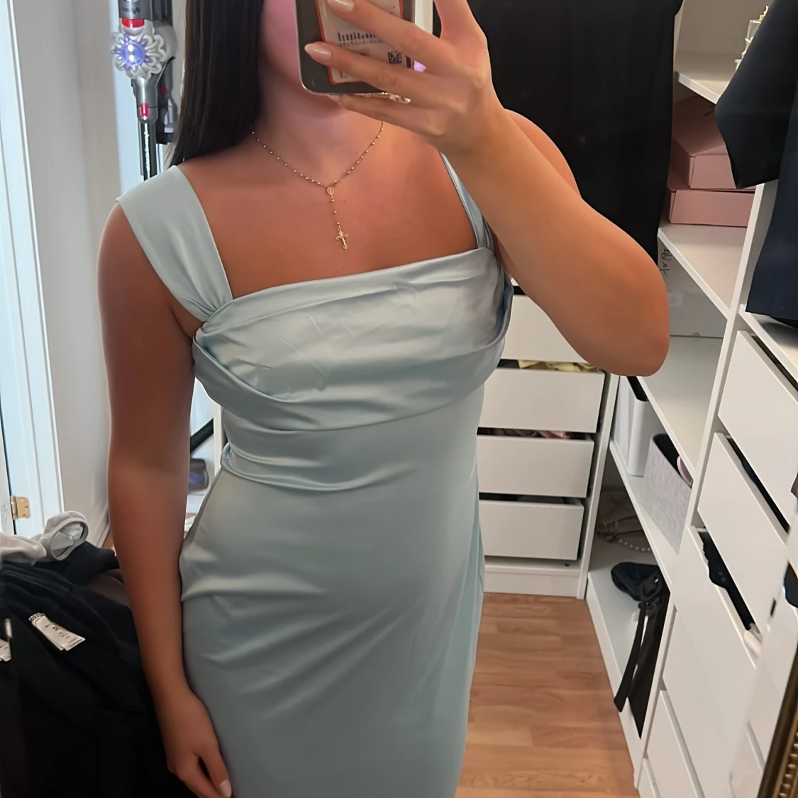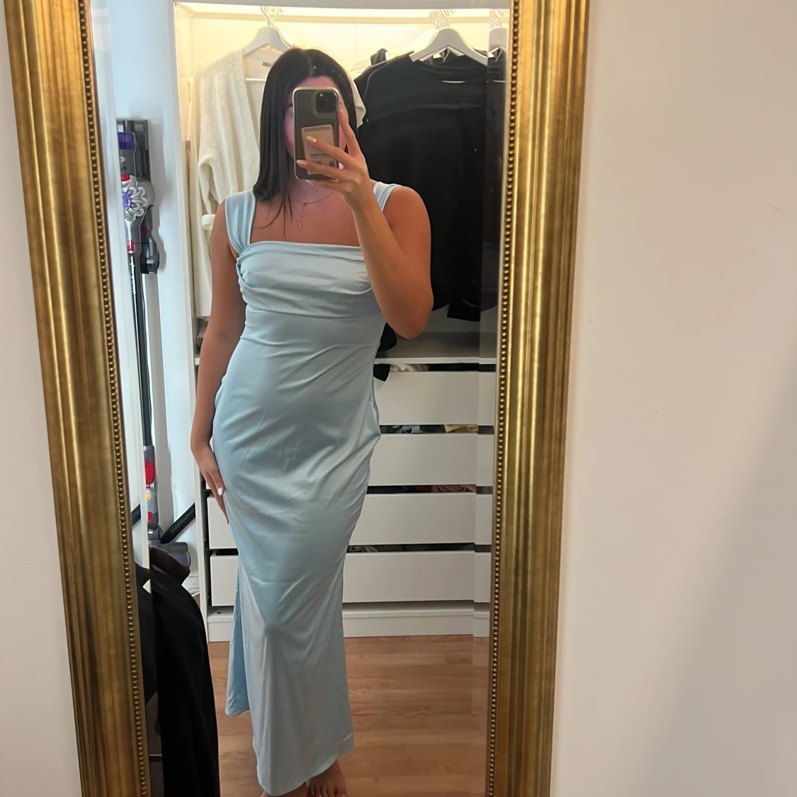Supersnygg ljusblå långklänning med breda axelband och draperad överdel. Klänningen har en figurnära passform och är tillverkad i ett glansigt, mjukt material som ger en lyxig känsla. Perfekt för dig som vill sticka ut med en elegant och modern look.