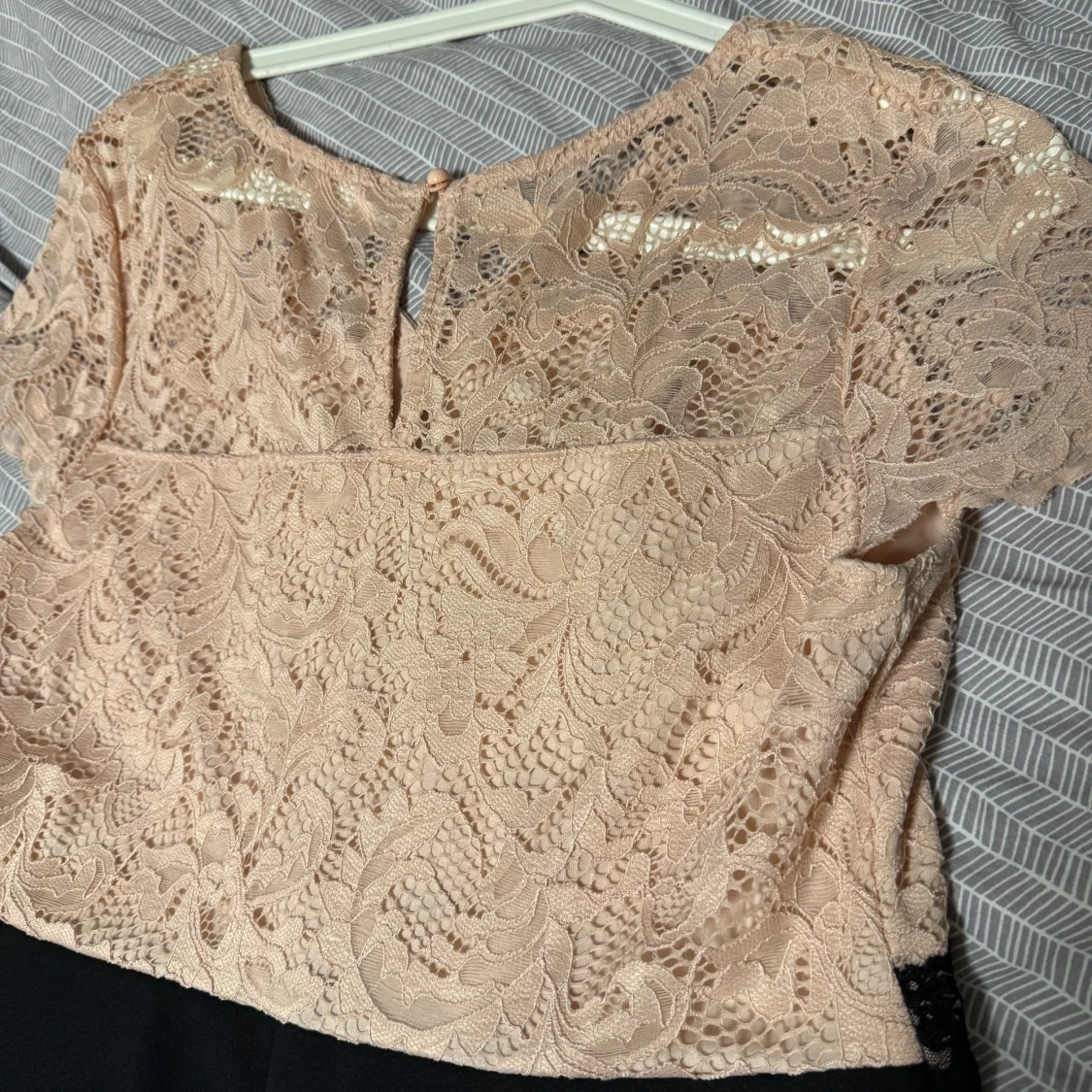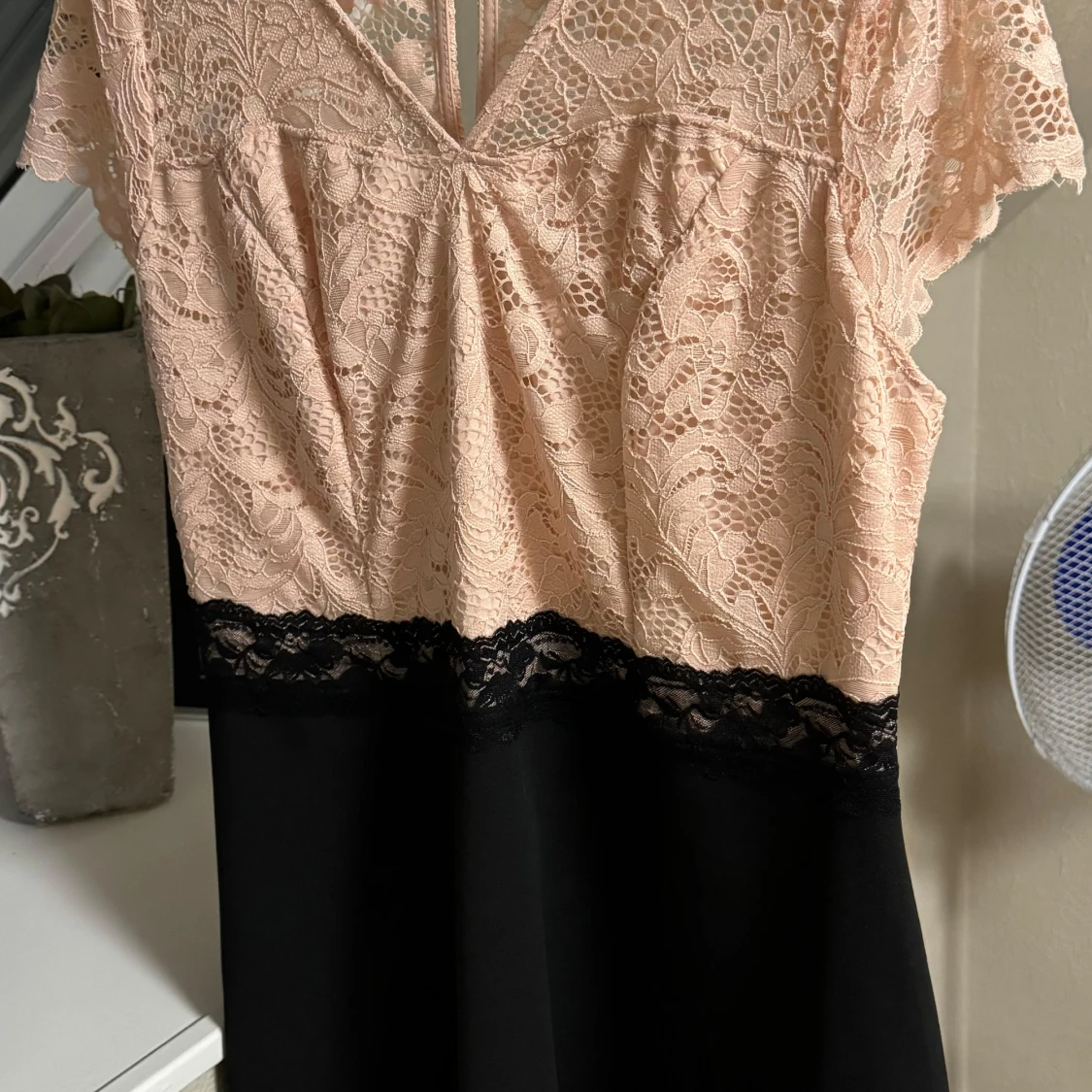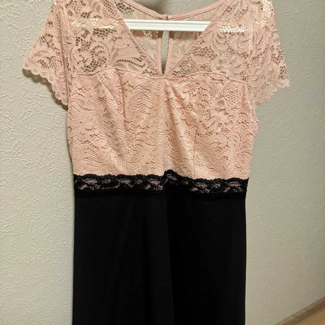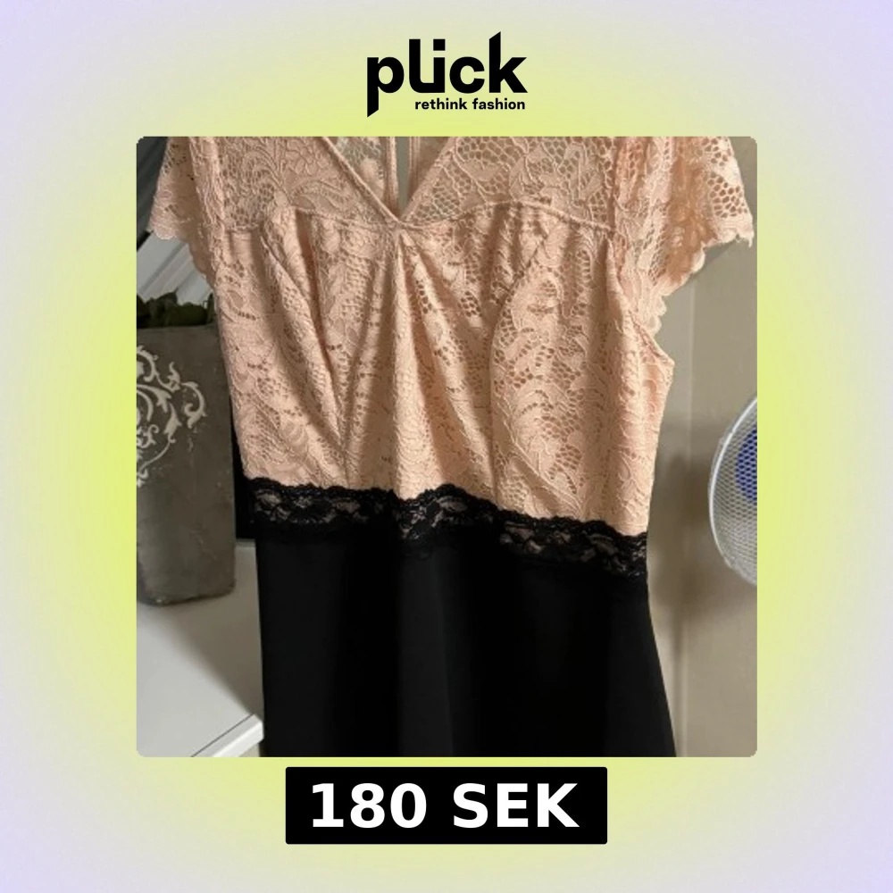 Elegant klänning från Bodyflirt med en överdel i ljusrosa spets och en svart kjol. Klänningen har korta ärmar och en v-ringad design med spetsdetaljer. Perfekt för en stilfull look.