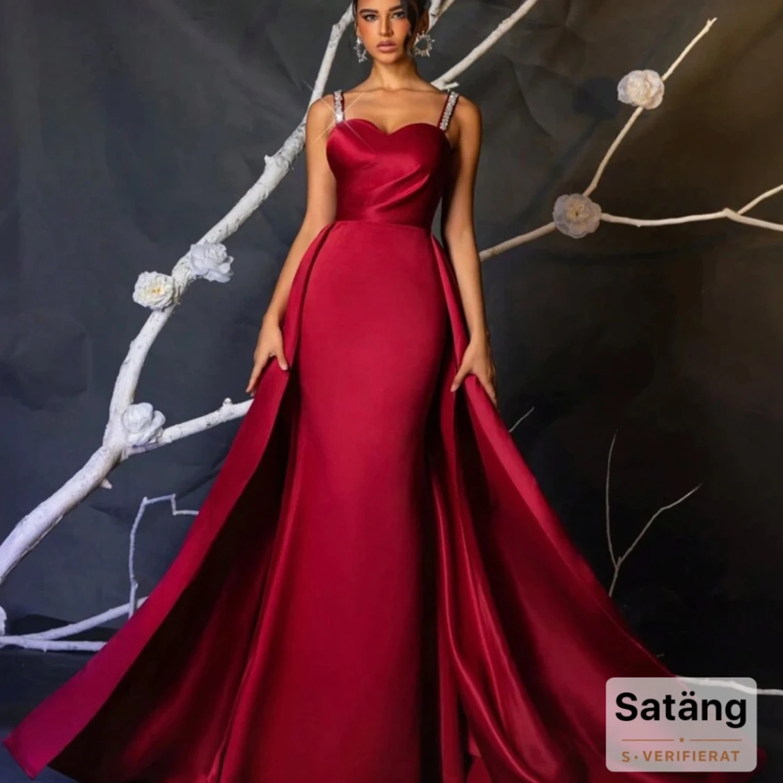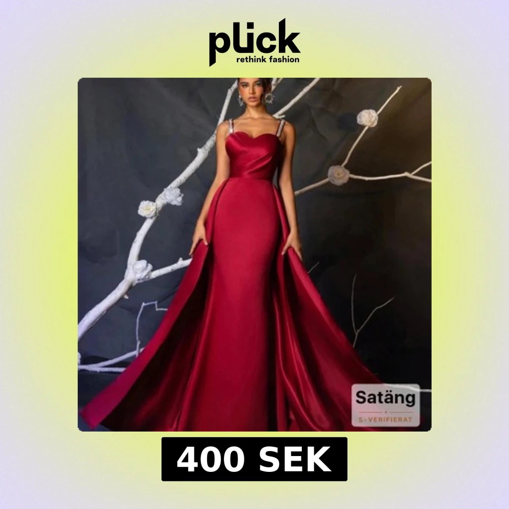 Magisk vinröd långklänning i satin med figurnära passform och bred, svepande kjol. Klänningen har smala axelband med glittrande detaljer och en snygg sweetheart-ringning. Perfekt för dig som vill sticka ut på bal eller fest.