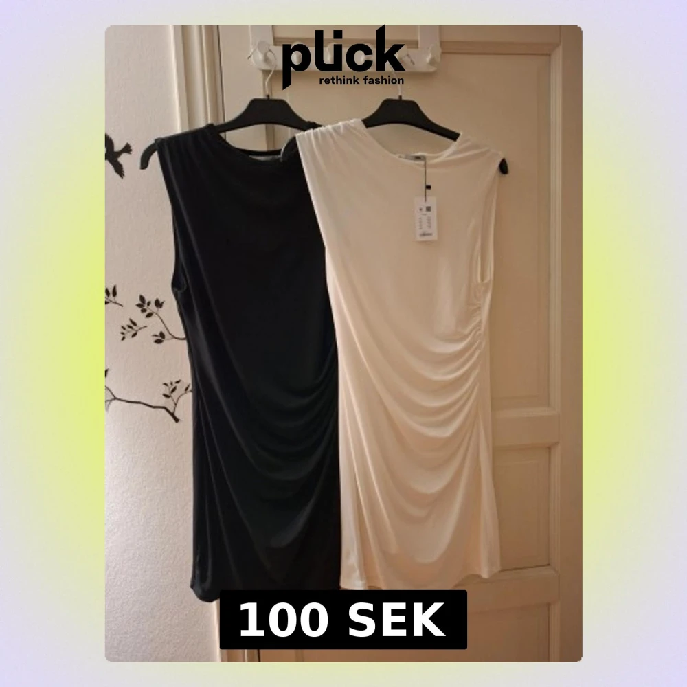 Två stilrena kortklänningar , en i svart och en i vit. Båda är ärmlösa med rund halsringning och har snygg drapering på ena sidan som ger en cool och modern look. Materialet känns mjukt och stretchigt, perfekt för dig som gillar minimalistisk stil. 100kr st