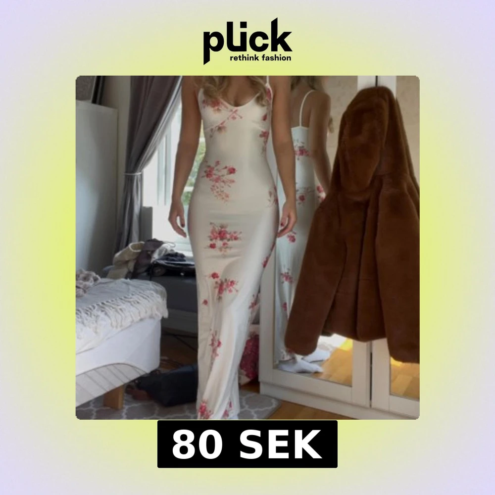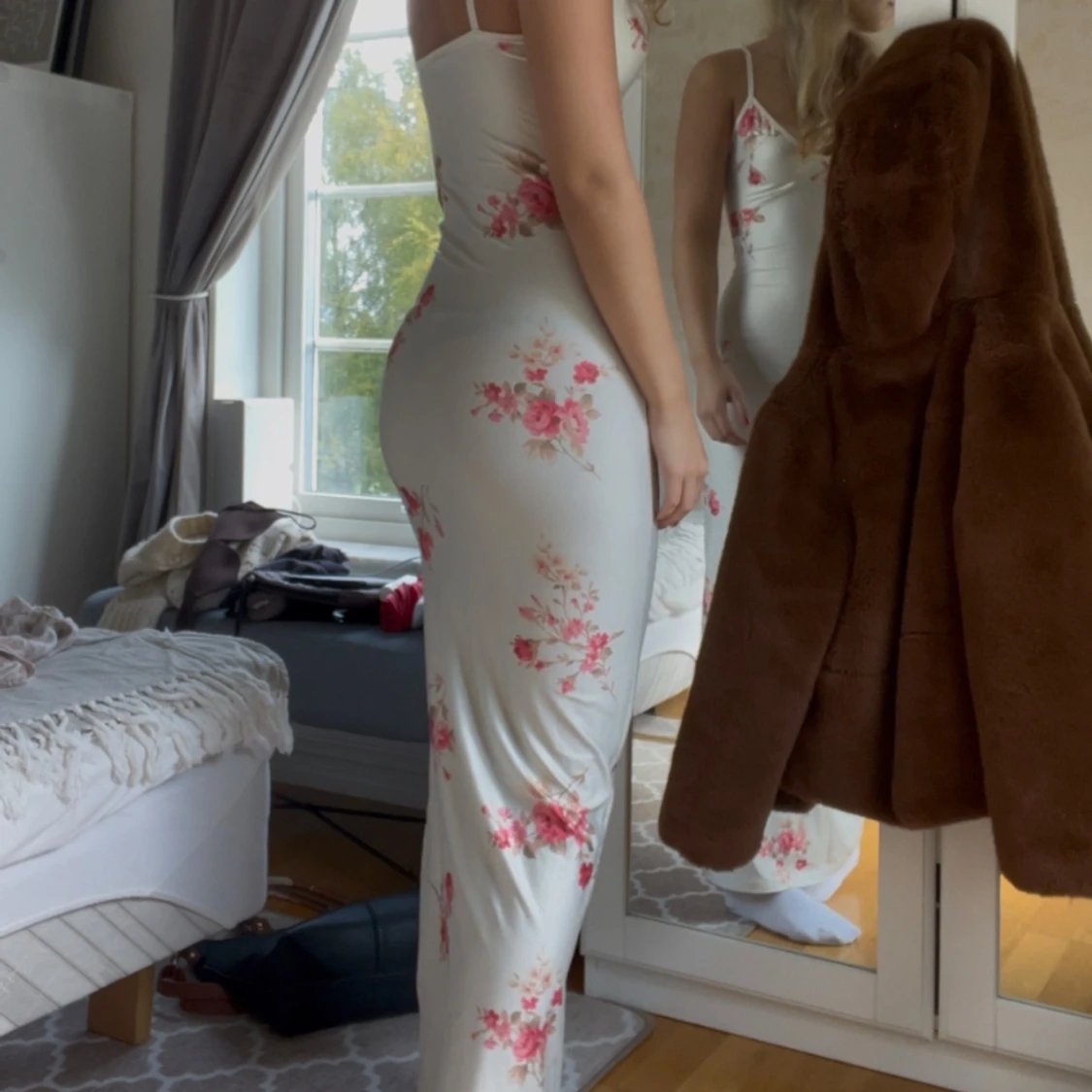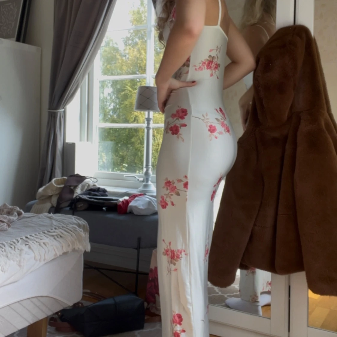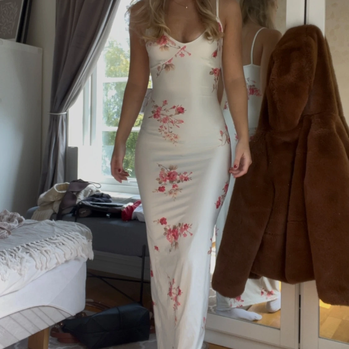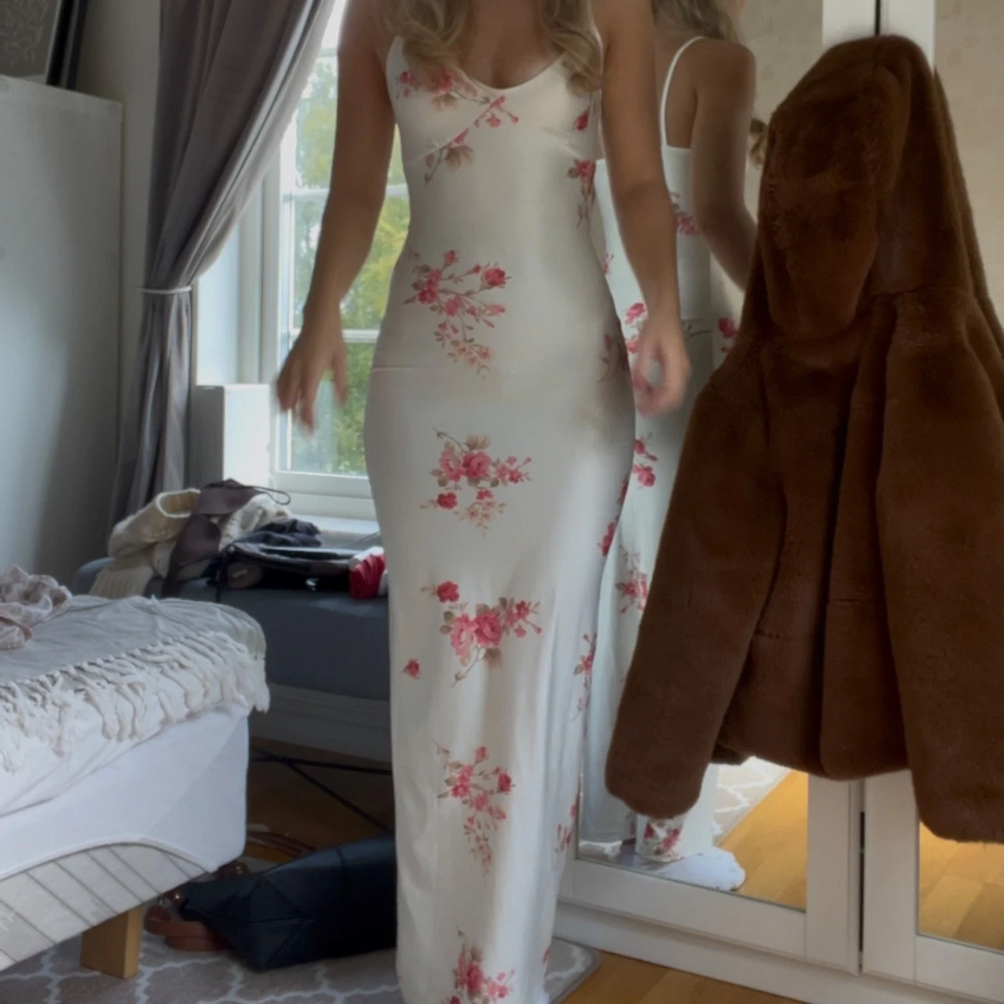 Supersnygg långklänning i vit med rosa blommigt mönster och smala axelband. Klänningen har en figurnära passform och v-ringad hals. Perfekt för sommarens alla tillfällen när du vill känna dig extra fin.
