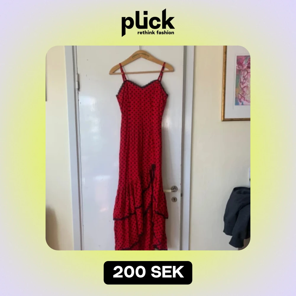 Skitball långklänning i prickigt mönster🪴har som en lite slits med volanger och spets (se bild). Sitter så fint och är väldigt skönt men har aldrig riktigt använt den😅skriv för fler bilder eller frågor🪴🪴🪴öppen för prutning
