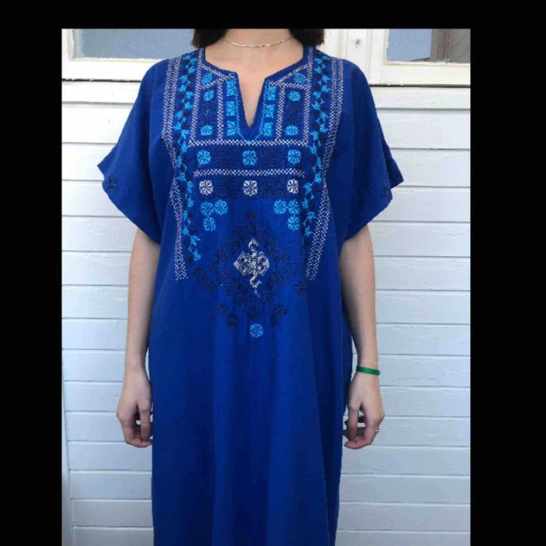 Blå hellång kaftan/klänning med broderier. Den är i fint begagnat skick och den har inga hål eller fläckar. 100% bomull. Finns inga lappar med märket på. Personen på bilden är 158 cm och kaftanen går ner till fötterna.