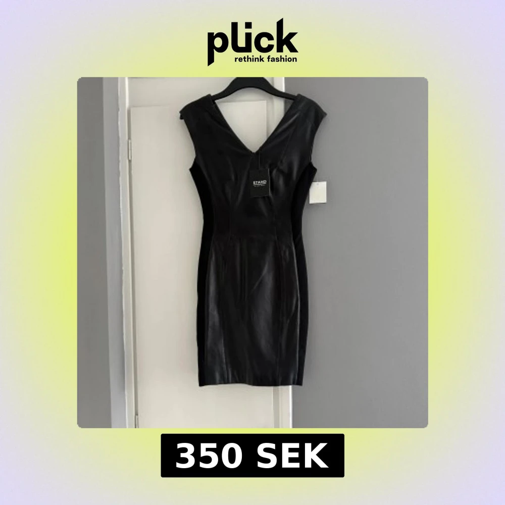 Supersnygg svart kortklänning från Stand Studio i skinn och tyg. Lamp leather. Klänningen är ärmlös med v-ringning både fram och bak, figurnära passform och dragkedja i ryggen. Perfekt för dig som vill ha en edgy och stilren look. Ny pris 2999kr