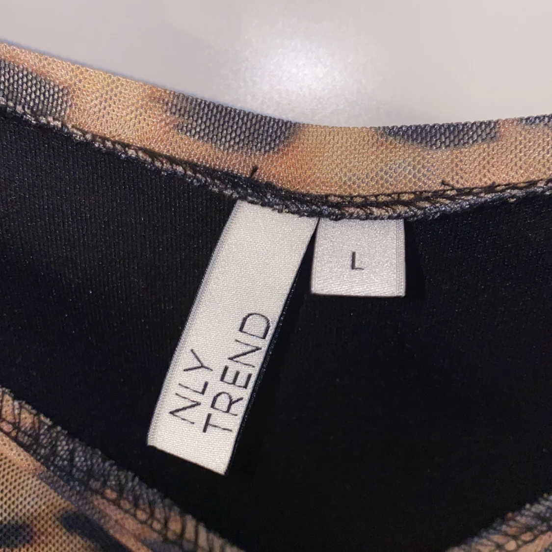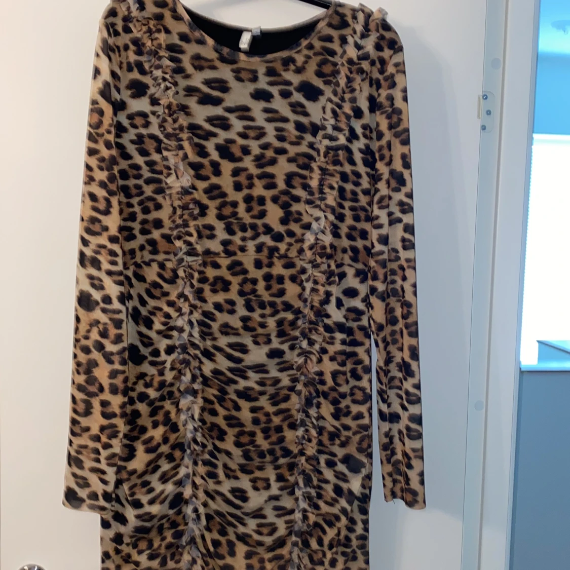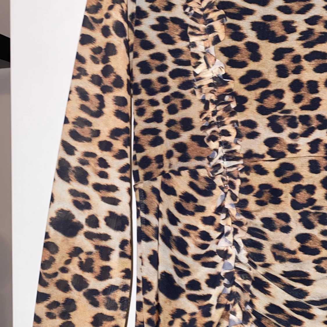 Miniklänning med långa mesh-ärmar och rouch-detalj. Leopardmönstrad. Strl L. Använd en gång.