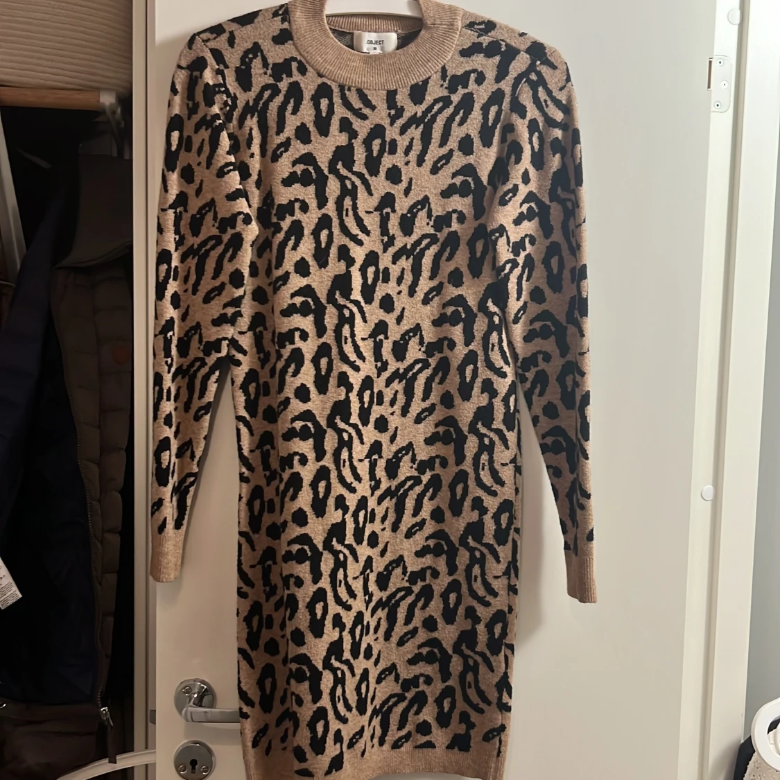 Snygg leopardmönstrad klänning från Object i brunt och svart leopard mönster. Klänningen har långa ärmar och en rund halsringning.