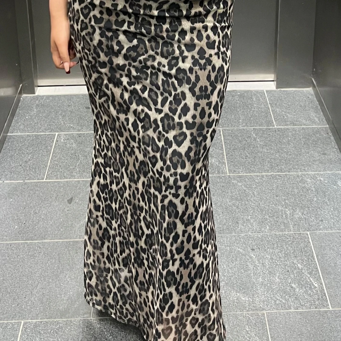 Snygg leopardmönstrad långklänning med smala axelband. Perfekt för en djärv och trendig look. Klänningen har en figurnära passform som framhäver silhuetten.