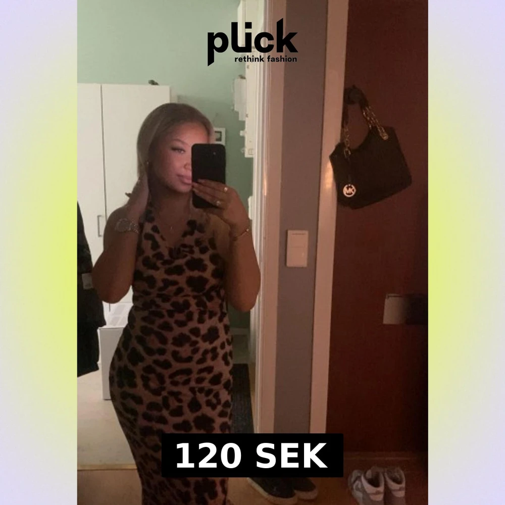 Säljer en snygg långklänning med leopardmönster i beige och svart. Klänningen har en figurnära passform och är ärmlös med halterneck. Perfekt för dig som vill sticka ut och älskar djurmönster!