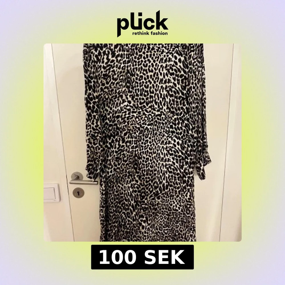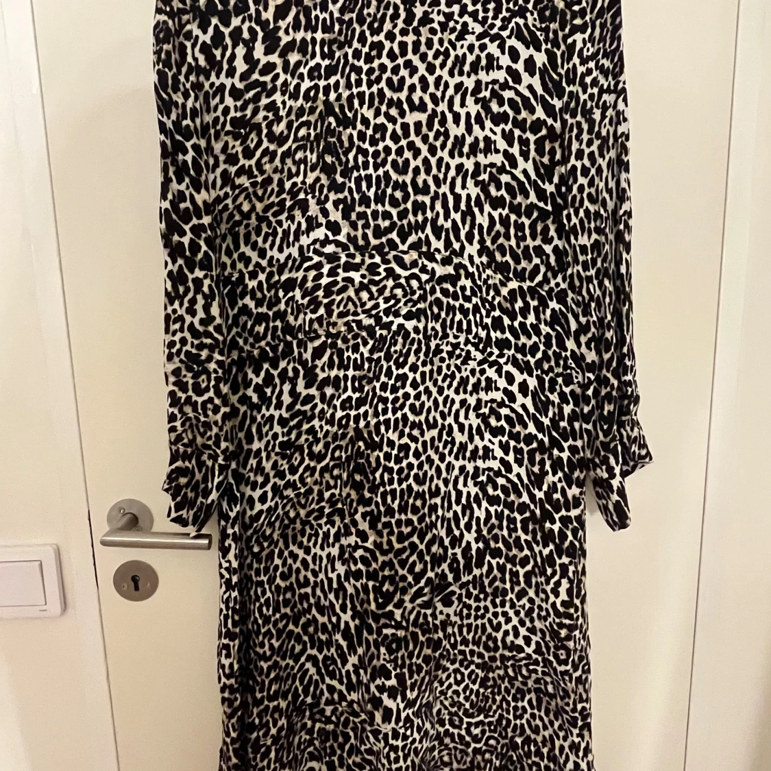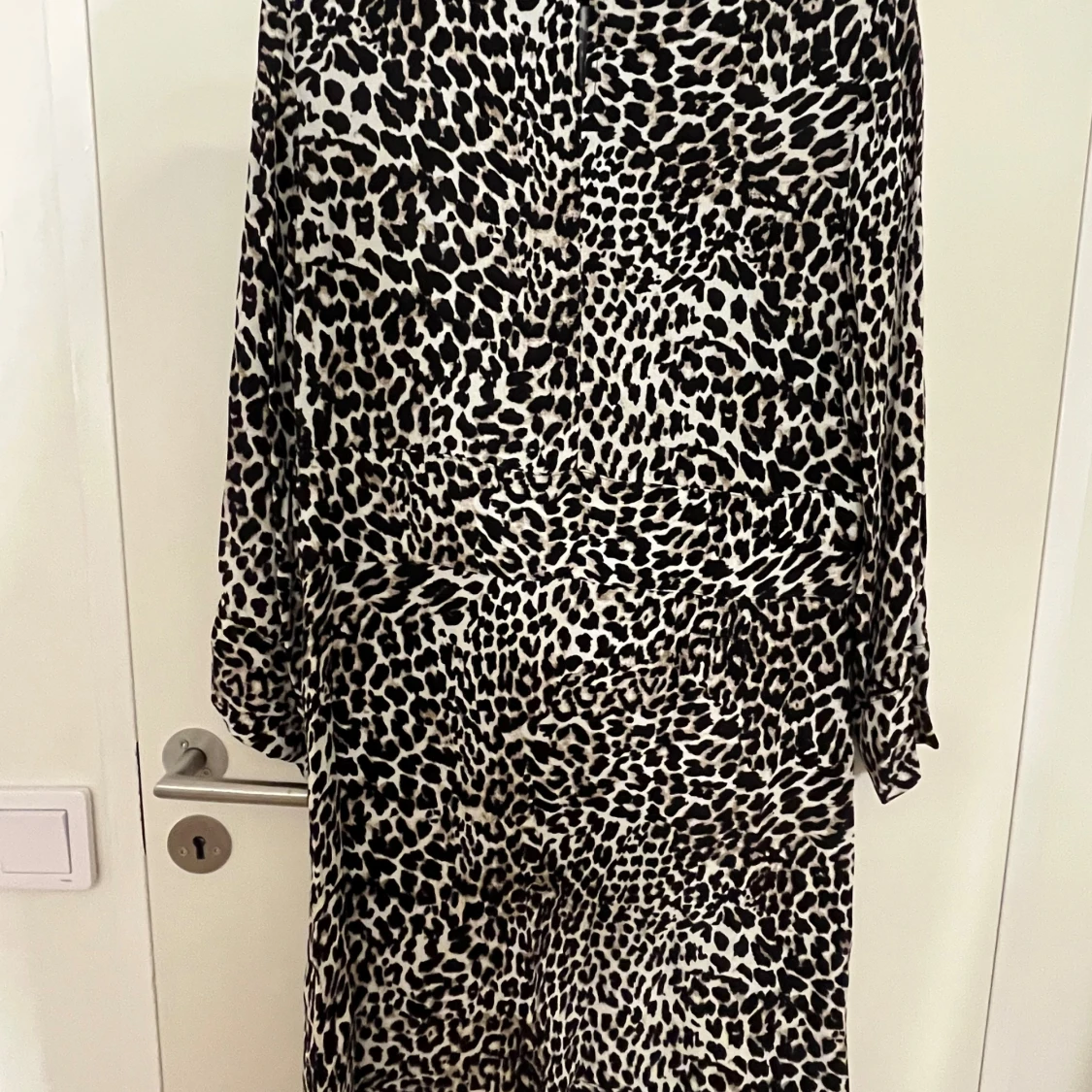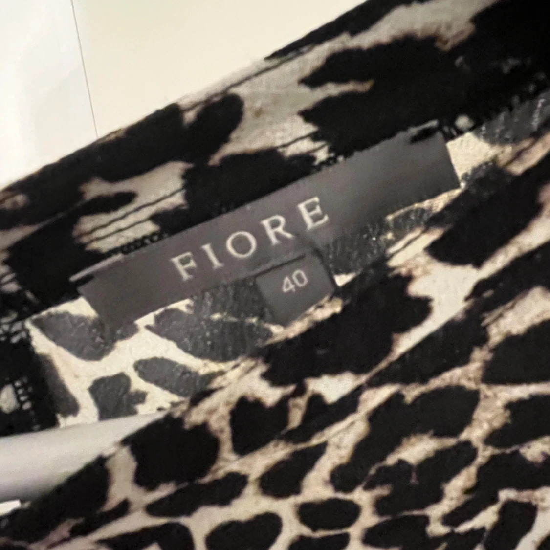 Säljer en snygg långklänning från Fiore med leopardmönster i svart och beige. Klänningen har långa ärmar och en avslappnad passform. Perfekt för dig som vill sticka ut med ett djurmönstrat plagg!