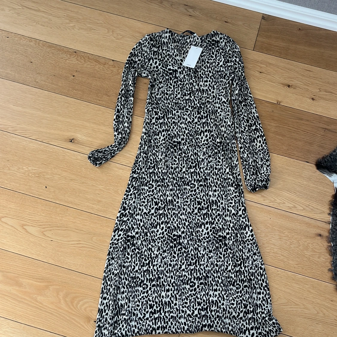 Snygg långklänning från MNG med svart och vit leopardmönster. Klänningen har v-ringning, långa ärmar och en figurnära passform. Perfekt för dig som vill sticka ut med ett djurmönster och gillar trendiga detaljer.