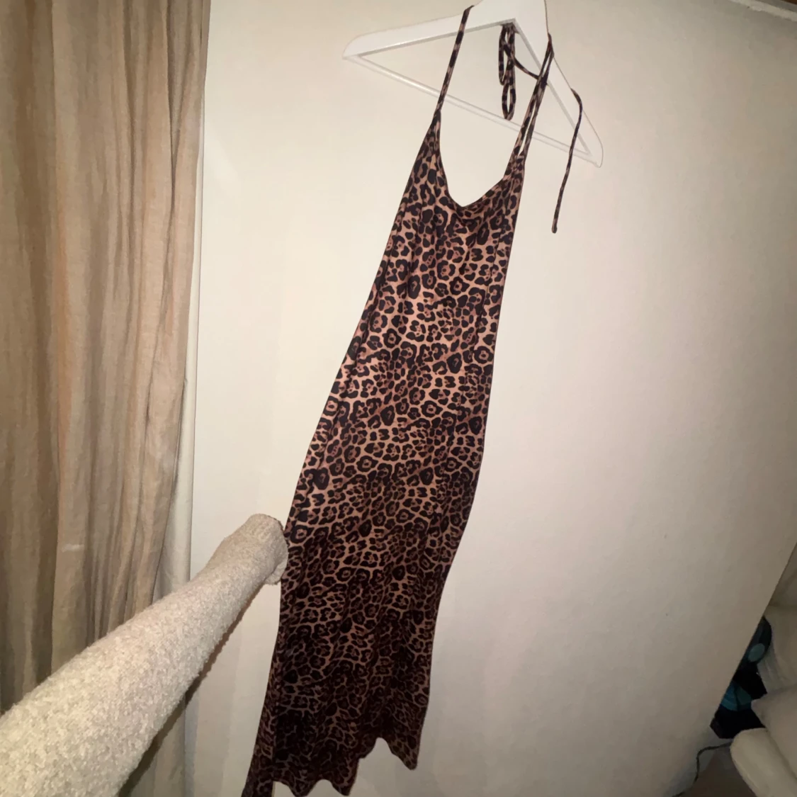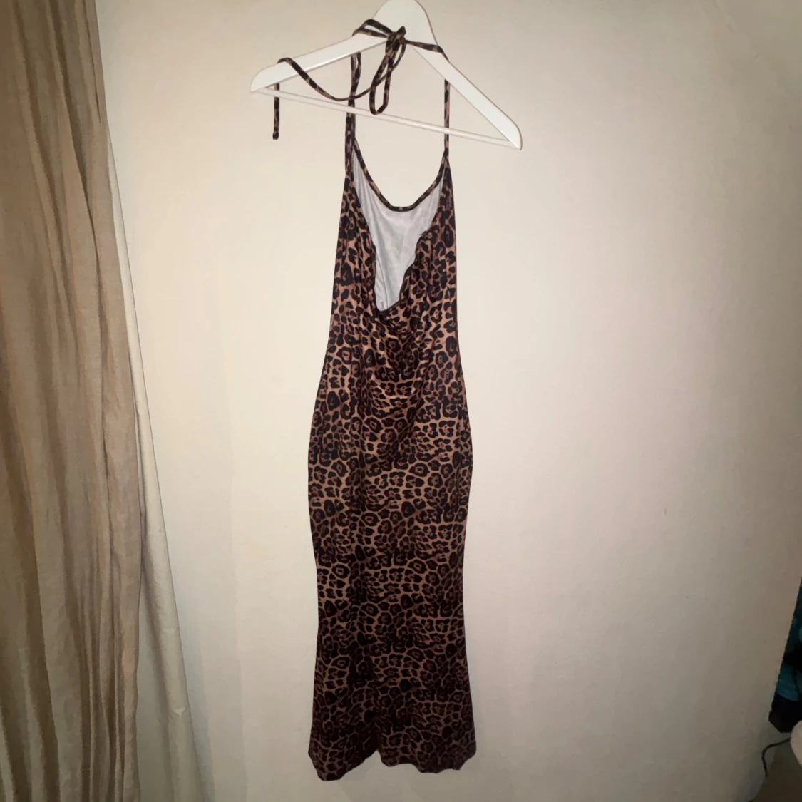 Säljer en snygg långklänning med leopardmönster och smala axelband som knyts i nacken. Klänningen har en figurnära passform och ärmlös design, perfekt för dig som vill sticka ut. Mjuk och följsam känsla i materialet. Aldrig använd, bara testad.