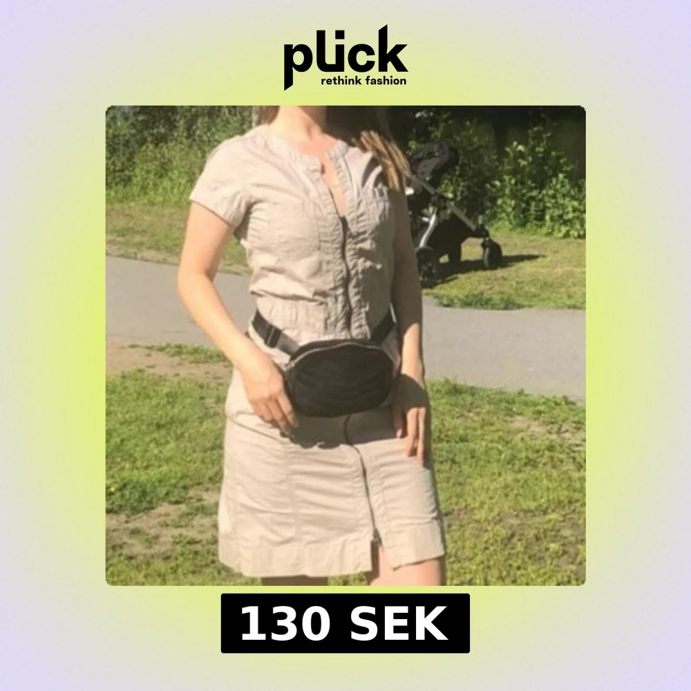 Kort beige klänning från Lindex med dragkedja framtill och två bröstfickor. Modellen har korta ärmar och markerad midja för en snygg siluett. Perfekt för dig som gillar enkel och stilren design.