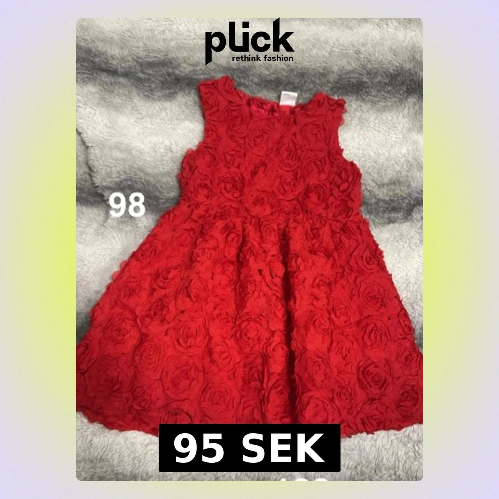 Supersöt röd klänning med 3D-blommor över hela tyget. Ärmlös modell med rund hals och utställd kjol. Perfekt för dig som vill sticka ut med en unik look. Passar till många olika tillfällen!🌸 Fint använt skick. Storlek 98