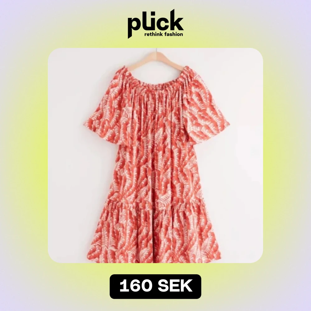 Röd/vit mönstrad off- shoulderklänning från Lindex. Storlek M. I mycket fint skick. Har rökfritt hem men har hund.