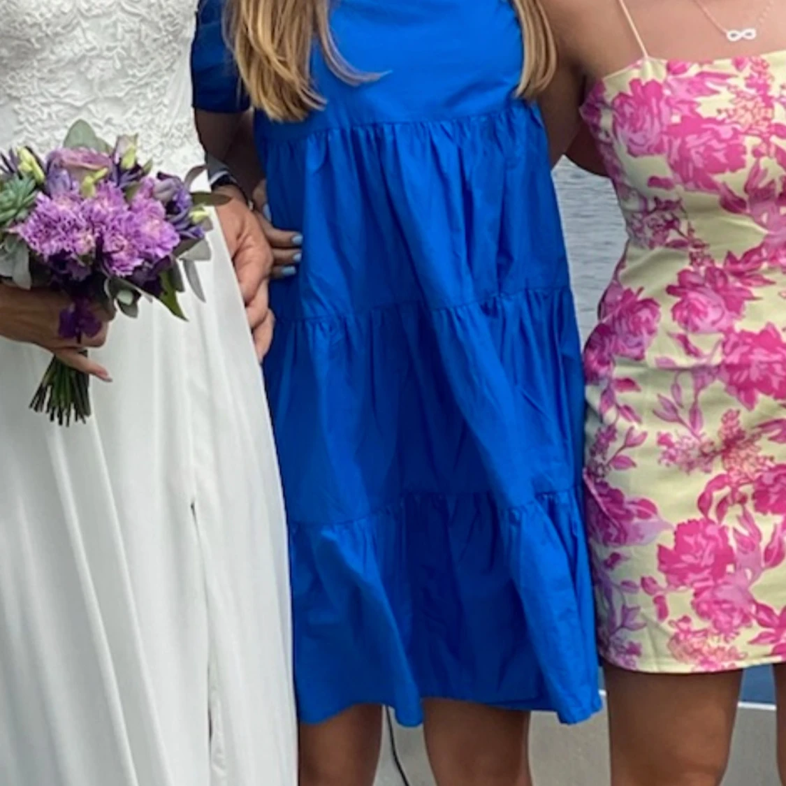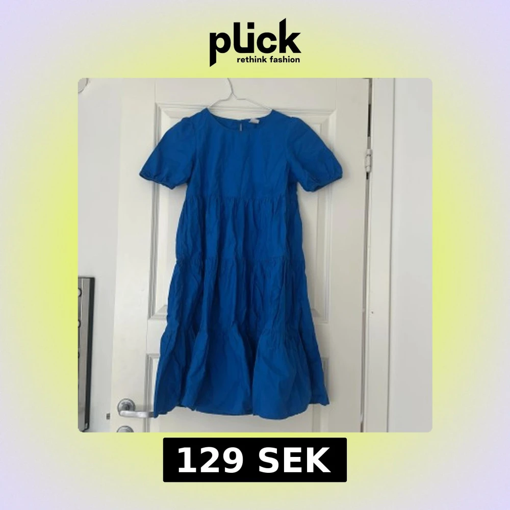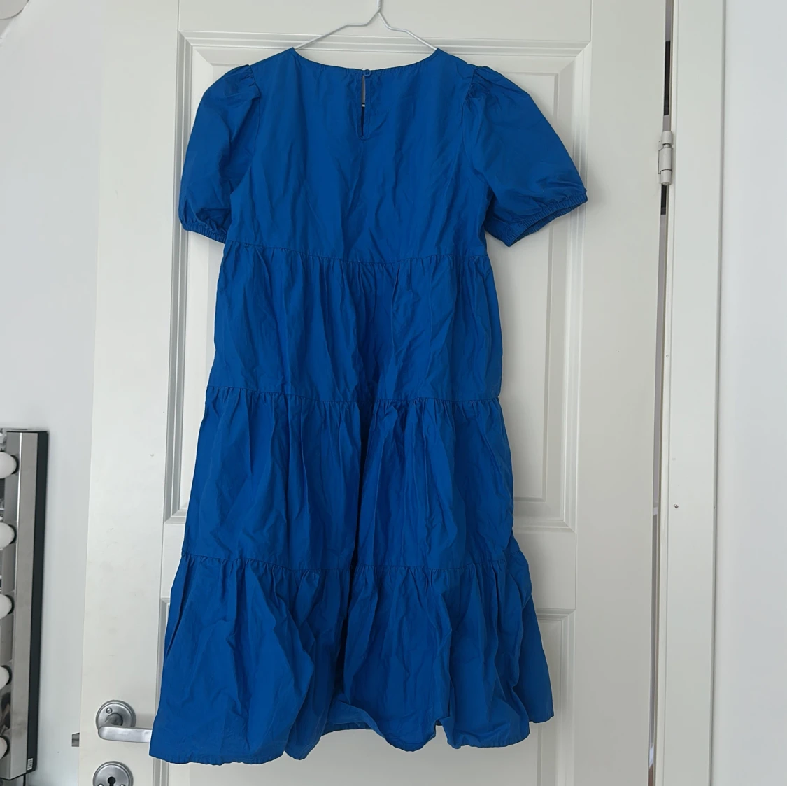 Supersöt blå klänning från Lindex med volanger och kort ärm. Klänningen har rund halsringning och knapp i nacken. Den slutar ungefär ovanför knäna på mig och den är använd endast en gång och därför i nyskick.