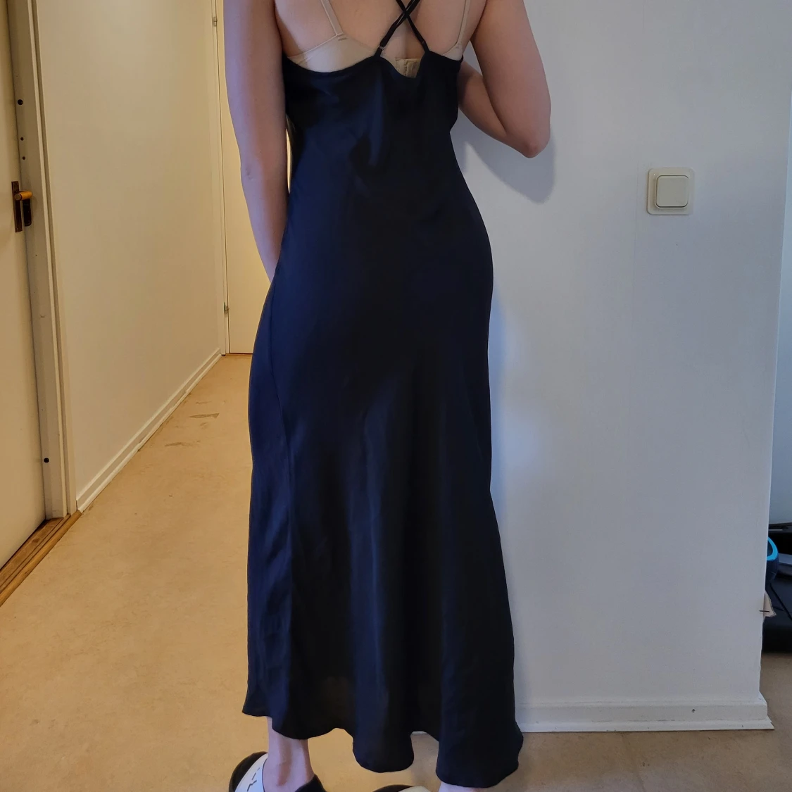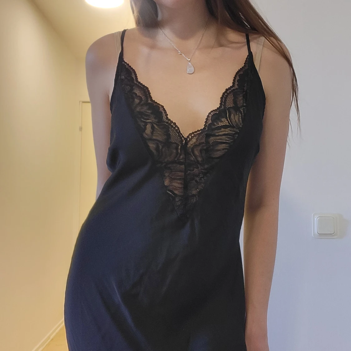 Supersöt slipklänning med spets från Lindex i "sidenmaterial". Ny och oanvänd. Så snyggt fall, se sista bild!! I storlek L och för stor för mig. Den är true to size (L). 😊 Svarar på alla frågor.
