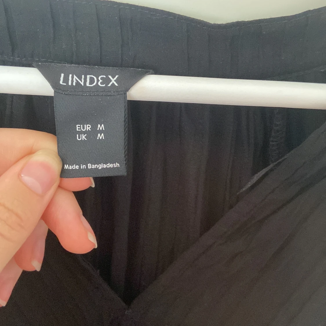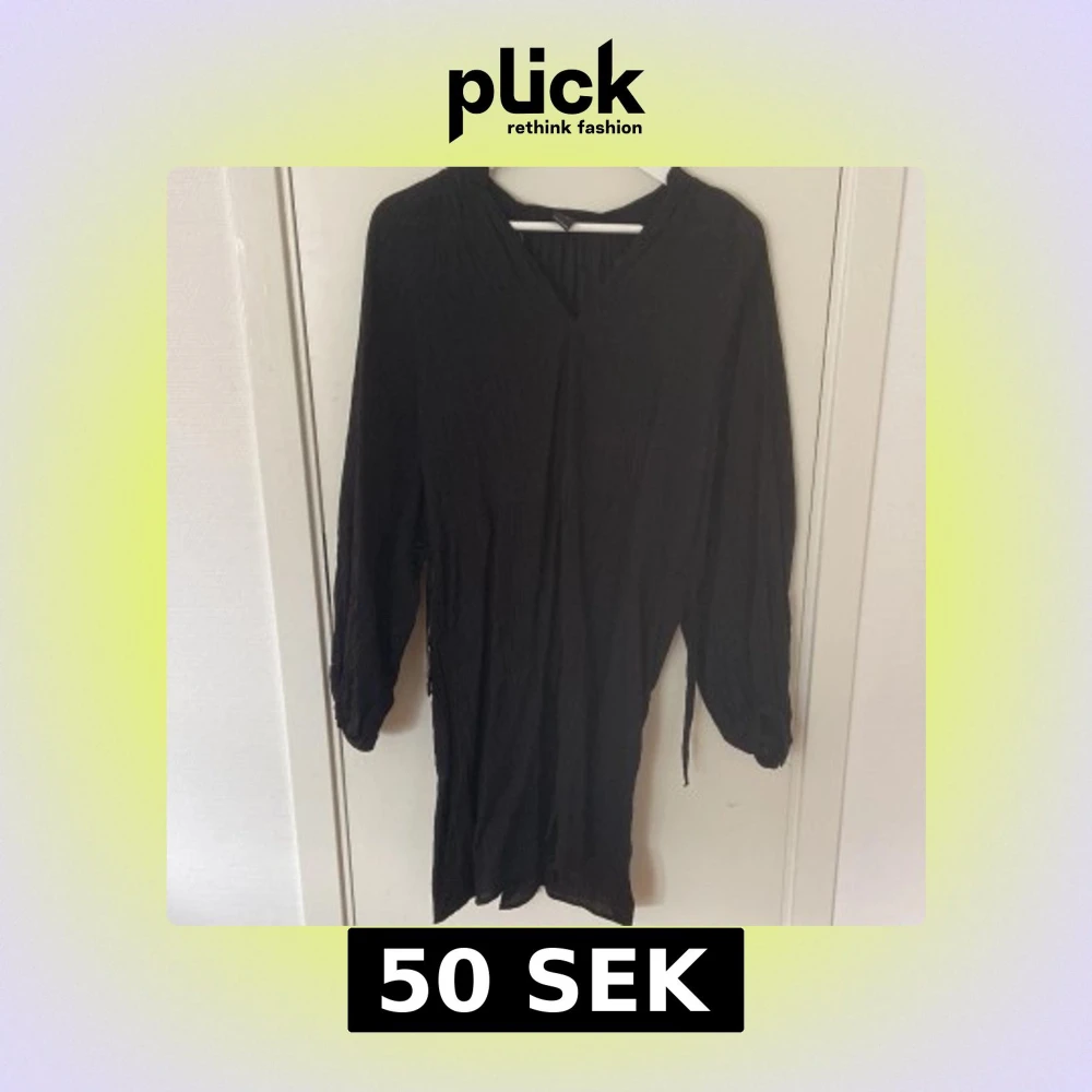 Svart omlottklänning från Lindex i storlek M. Klänningen har lång ärm, v-ringad hals och knytband i midjan. Materialet är lätt och har en skrynklig struktur som ger en cool och avslappnad vibe. Perfekt för dig som gillar enkel och stilren look.