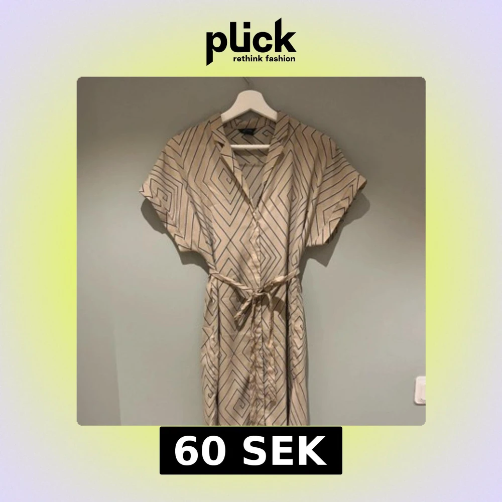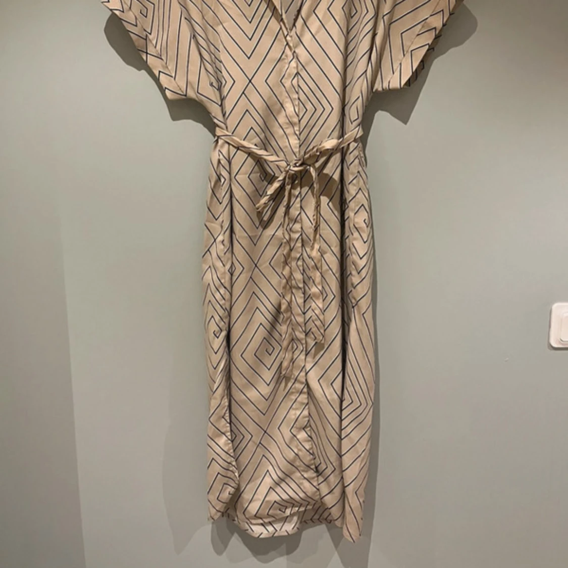 Snygg beige midiklänning med mönster. Klänningen har korta ärmar, knytband i midjan och v-ringad hals. Lätt och flowy känsla, perfekt både vår, sommar och höst.