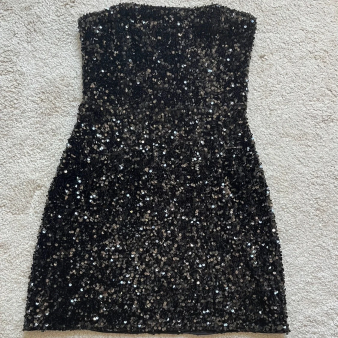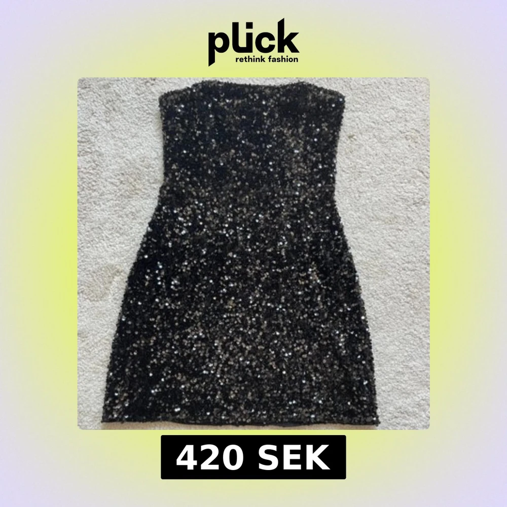Säljer en svart, axelbandslös kortklänning från Lindex i storlek S. Klänningen är täckt med glittriga paljetter som ger en riktigt festlig vibe. Den har en figurnära passform och är perfekt för dig som vill sticka ut med lite extra bling. Supersnygg till fest eller bal! Aldrig använd, prislappen kvar.