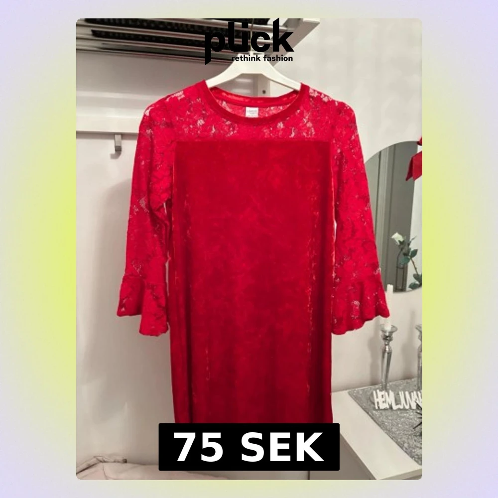 Snygg röd klänning från Lindex med långa spetsärmar och volangdetaljer vid ärmslut. Klänningen har en rund halsringning och är tillverkad i ett mjukt, glansigt tyg med spets upptill och på ärmarna. Perfekt för dig som vill sticka ut med färg och detaljer.