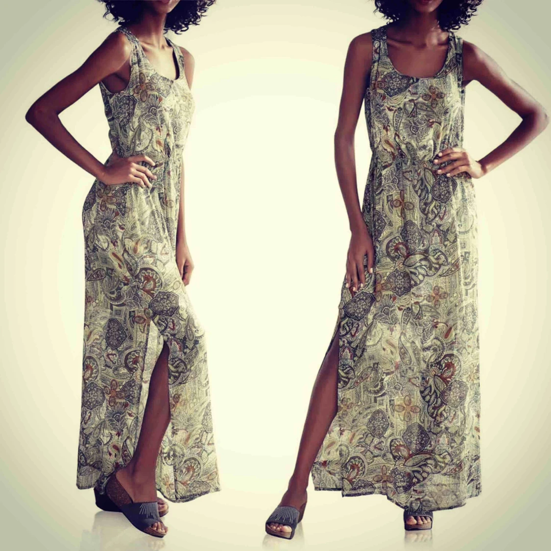 Maxiklänning från Linea Tesini. Längd: ca 136 cm Chiffong: 100% polyester Foder: 100% polyester. Storlek: 36, 38, 40, 42. Fri frakt https://www.nellasshop.com/products/gronmonstrad-maxiklanning