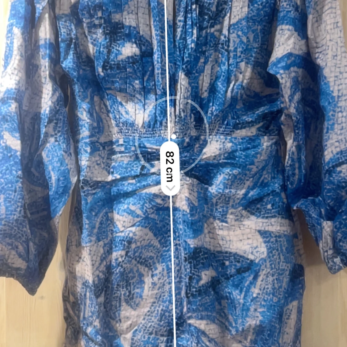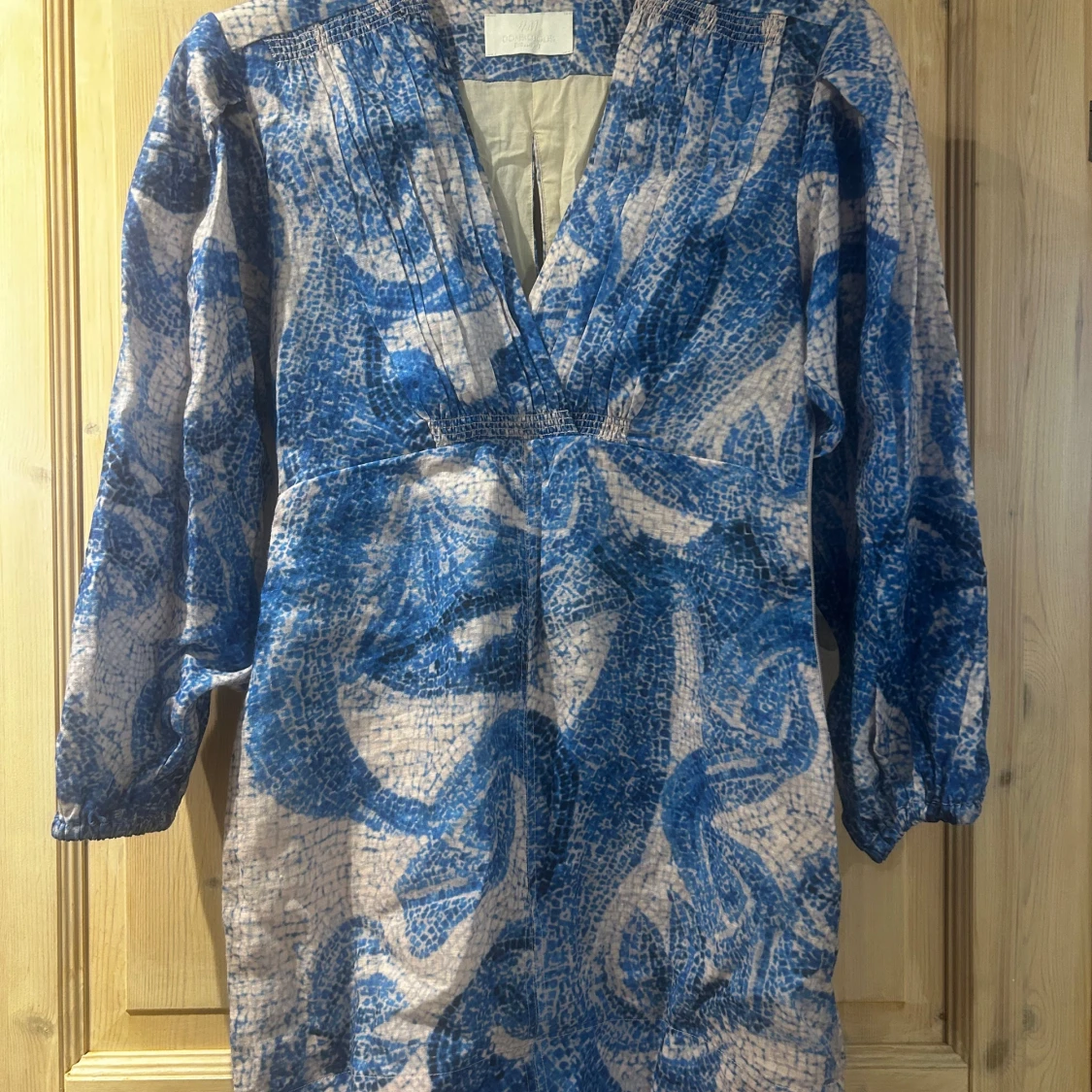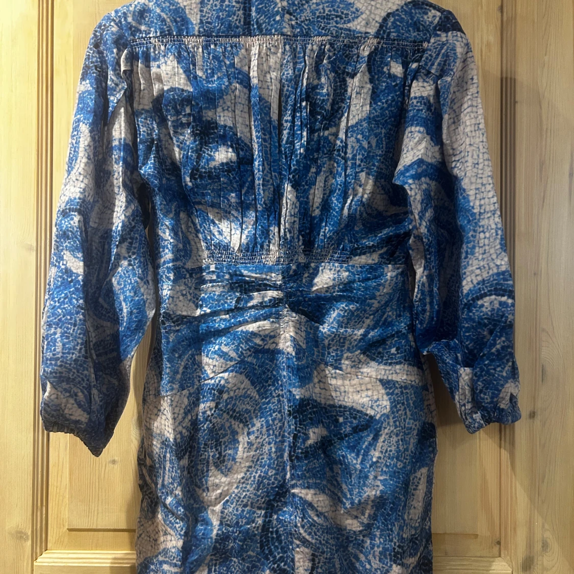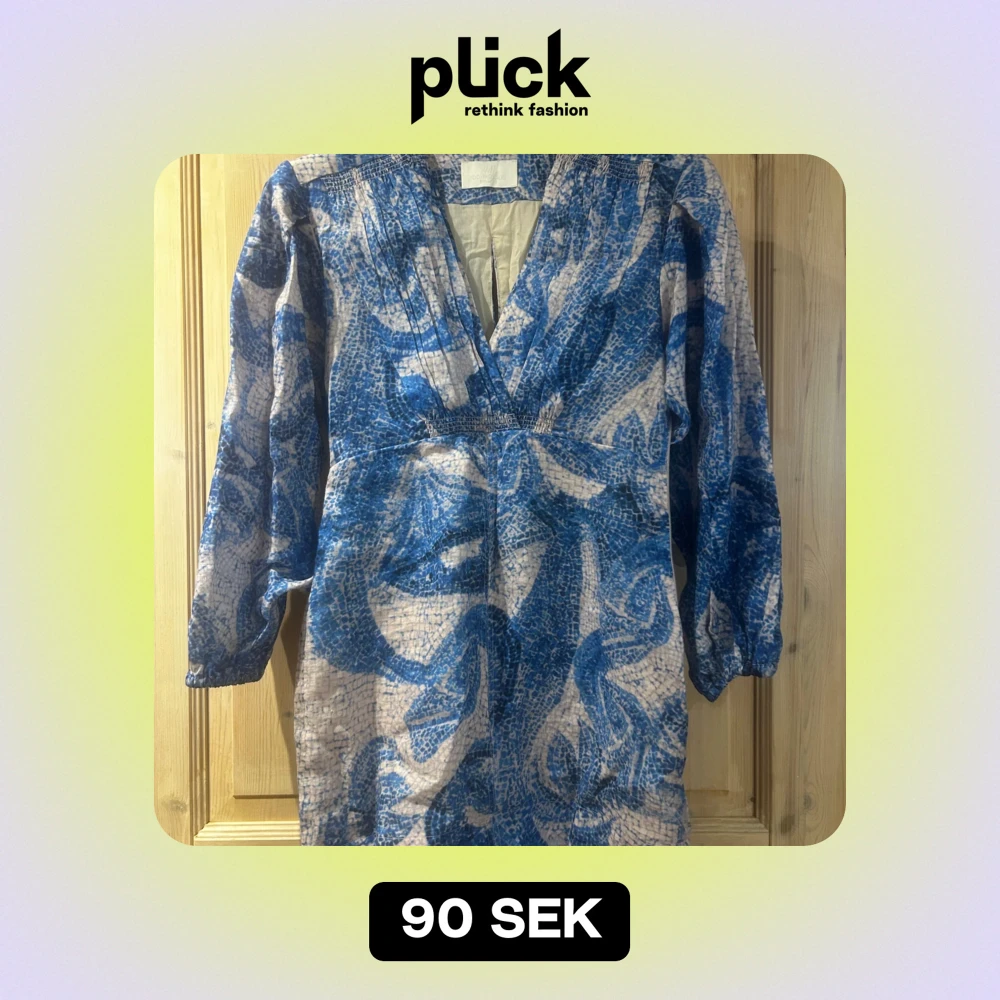 En blå-mänstrad klänning från H&M, storlek XS. Längd 82 cm. Finns att hämta i Järfälla. Linneblandning. Priset går att diskuteras.