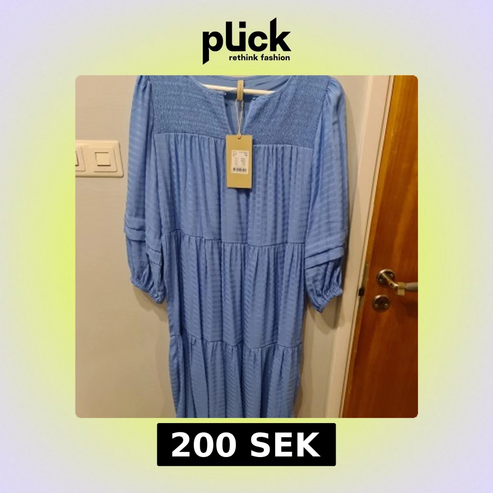 Säljer en ljusblå långklänning från Soyaconcept i storlek S. Klänningen har trekvartsärm, rynkade detaljer upptill och ett luftigt fall. Perfekt för dig som gillar en avslappnad och stilren look.