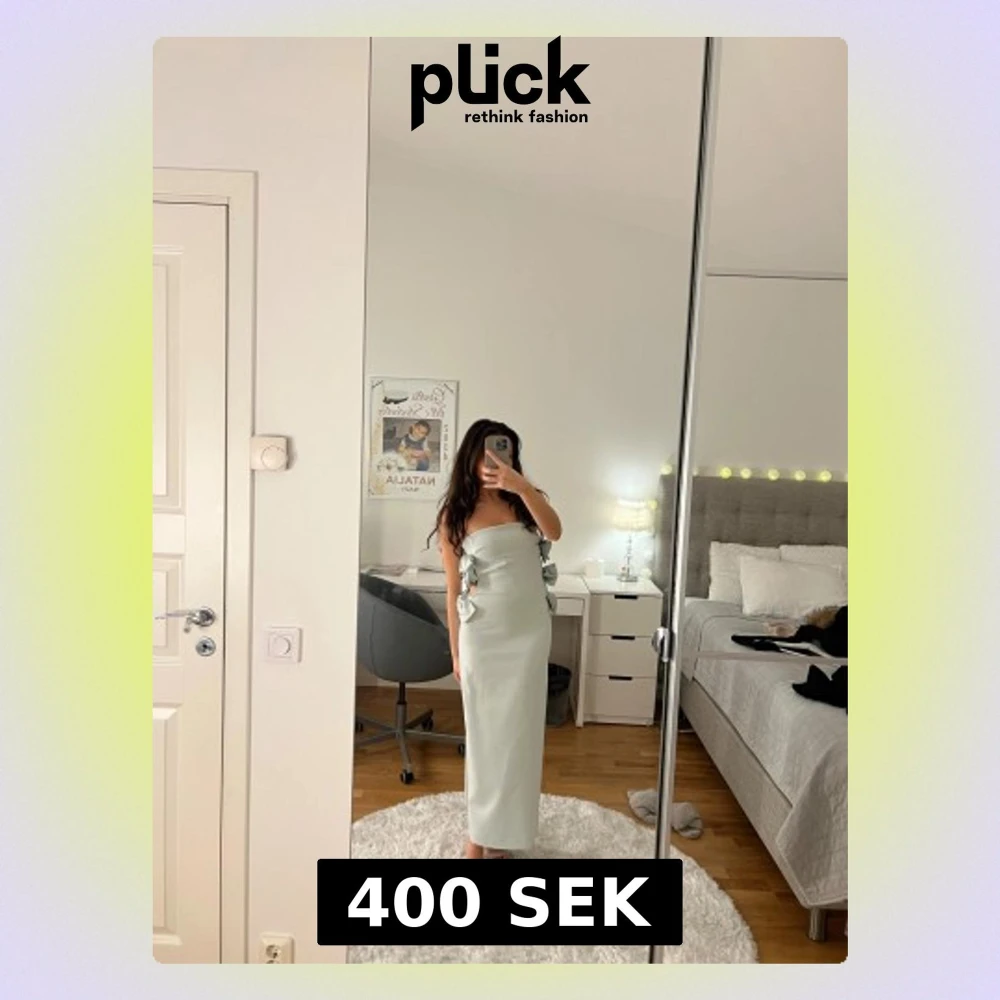 Säljer en elegant ljusblå långklänning med axelbandslös design och snygga rosetter längs sidan. Klänningen har en slits bak och är figurnära med cut-out detaljer vid midjan. Perfekt för dig som vill sticka ut med en stilren look. Endast använd 2 gånger💙