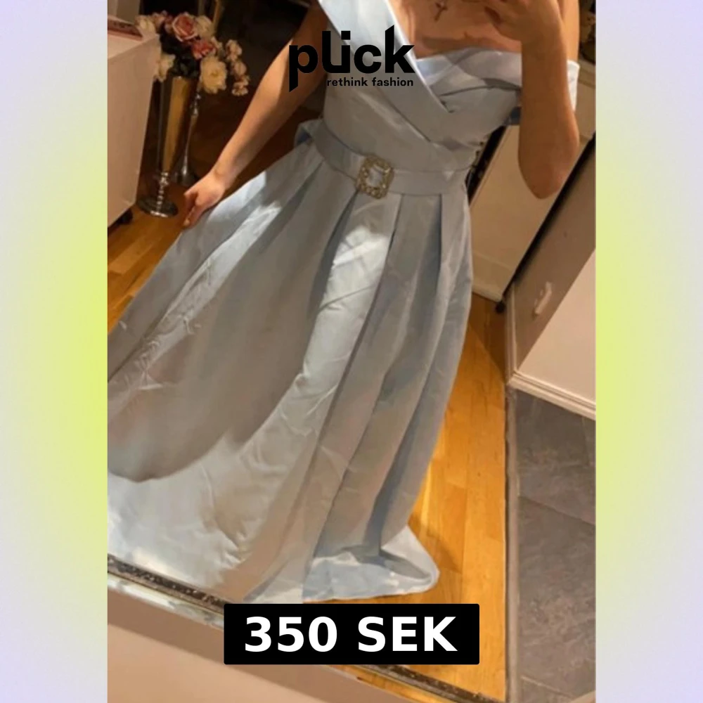 Säljer en elegant ljusblå långklänning med offshoulder och omlott upptill. Klänningen har ett brett bälte med dekorativt spänne i midjan och ett svepande, voluminöst kjolparti. Perfekt för bal eller fest! Materialet känns som satin och ger en lyxig känsla. Klänningen har även en slits och är helt ny aldrig använd, prislapp hänger kvar
