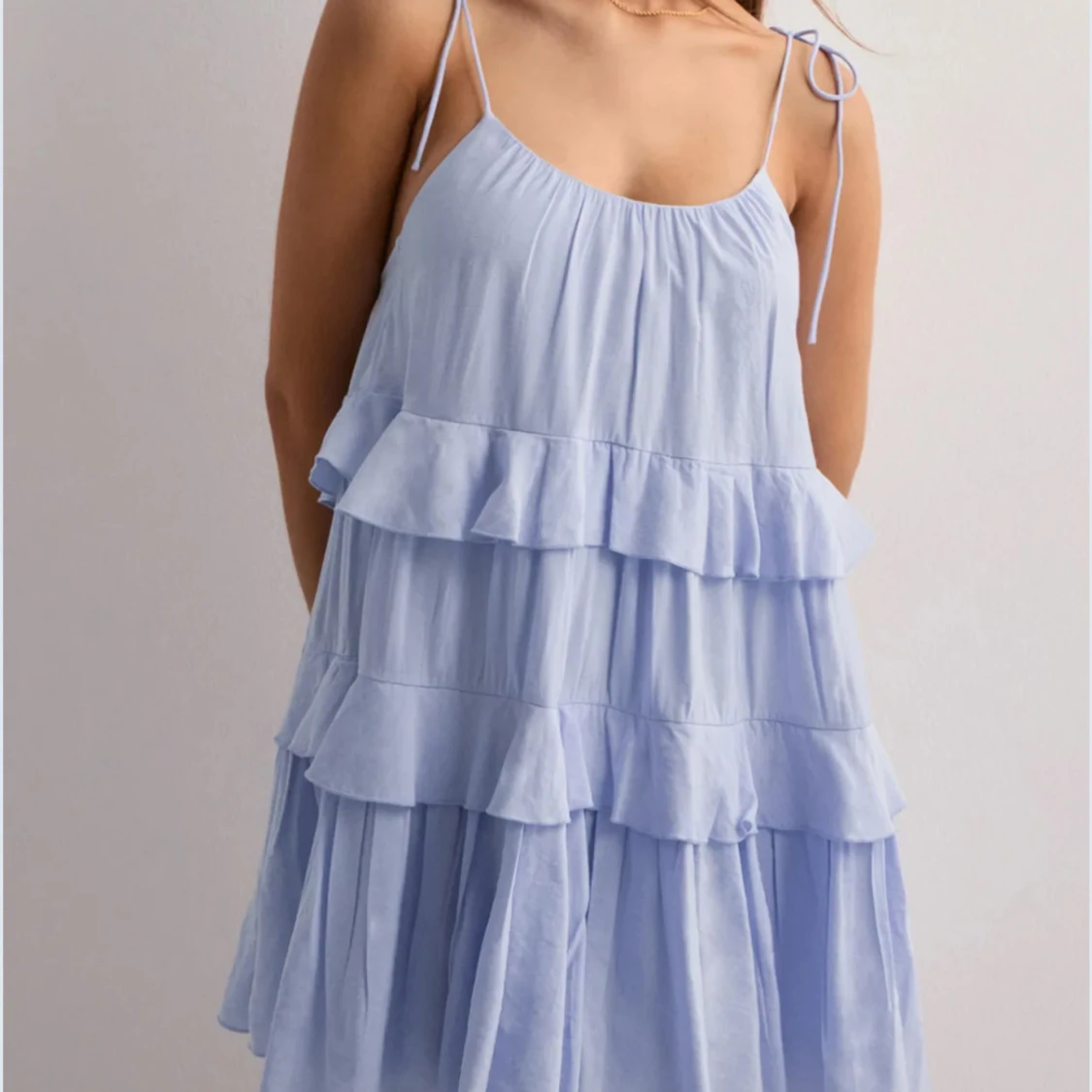Supersöt ljusblå kortklänning med volanger och tunna knytbara axelband. Klänningen har en luftig passform och öppen rygg, perfekt för varma dagar. Tillverkad i ett lätt och mjukt material som känns skönt mot huden.