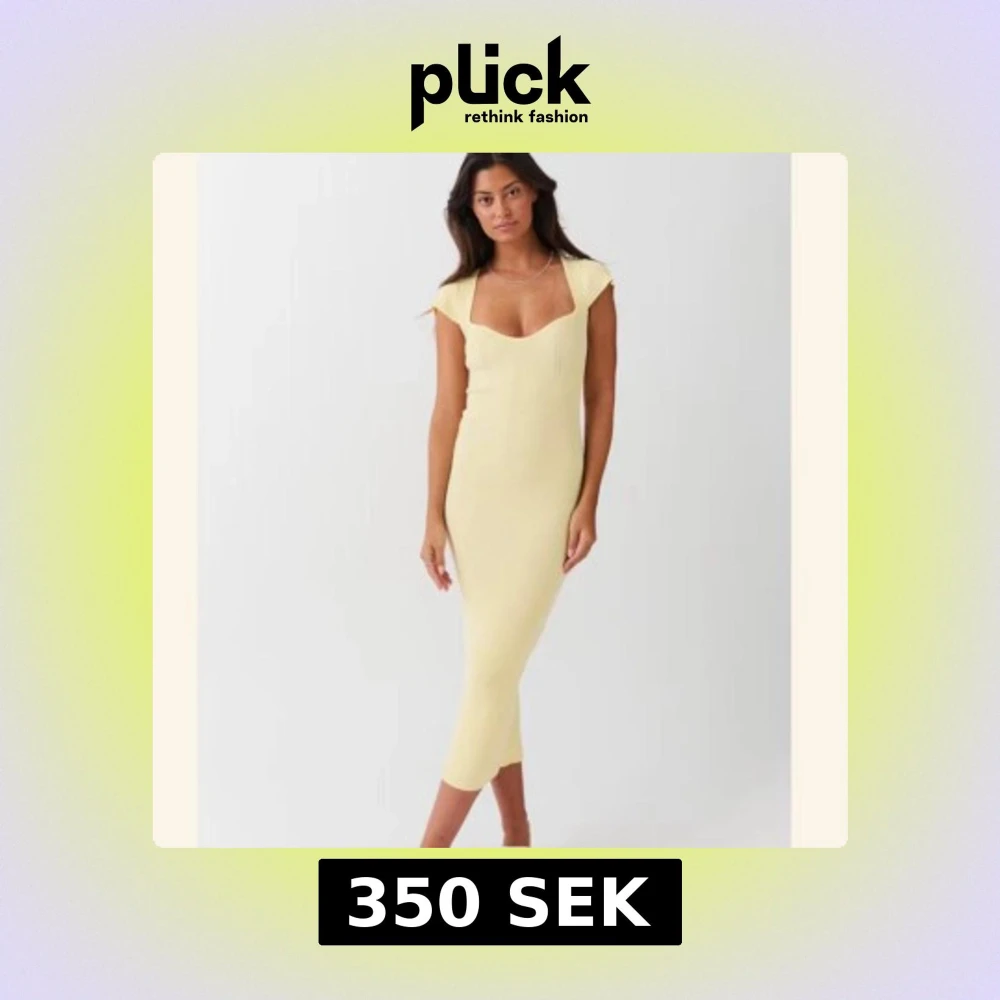 Supersnygg ljusgul ribbad långklänning med fyrkantig urringning och korta ärmar. Klänningen har en tight passform som framhäver figuren och är perfekt för varma dagar. Enkel men trendig design som passar till sneakers eller sandaler. Klänningen är helt ny, aldrig använd!