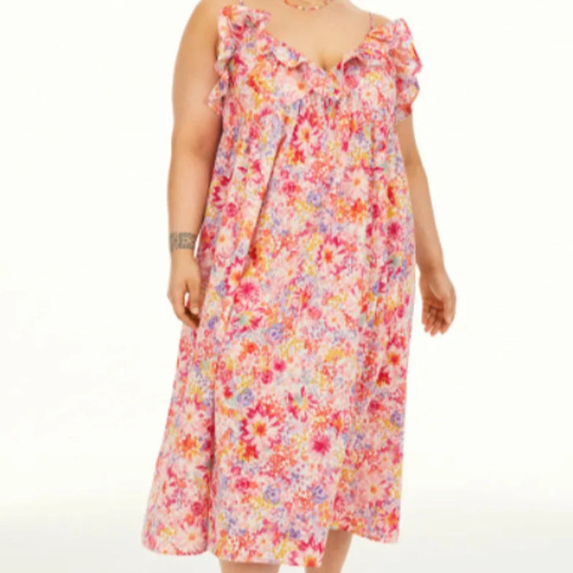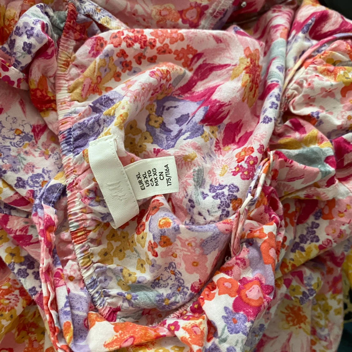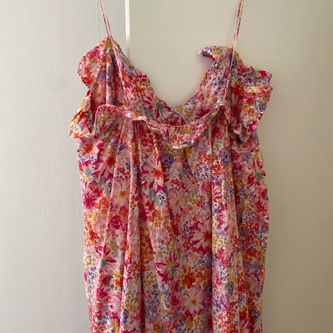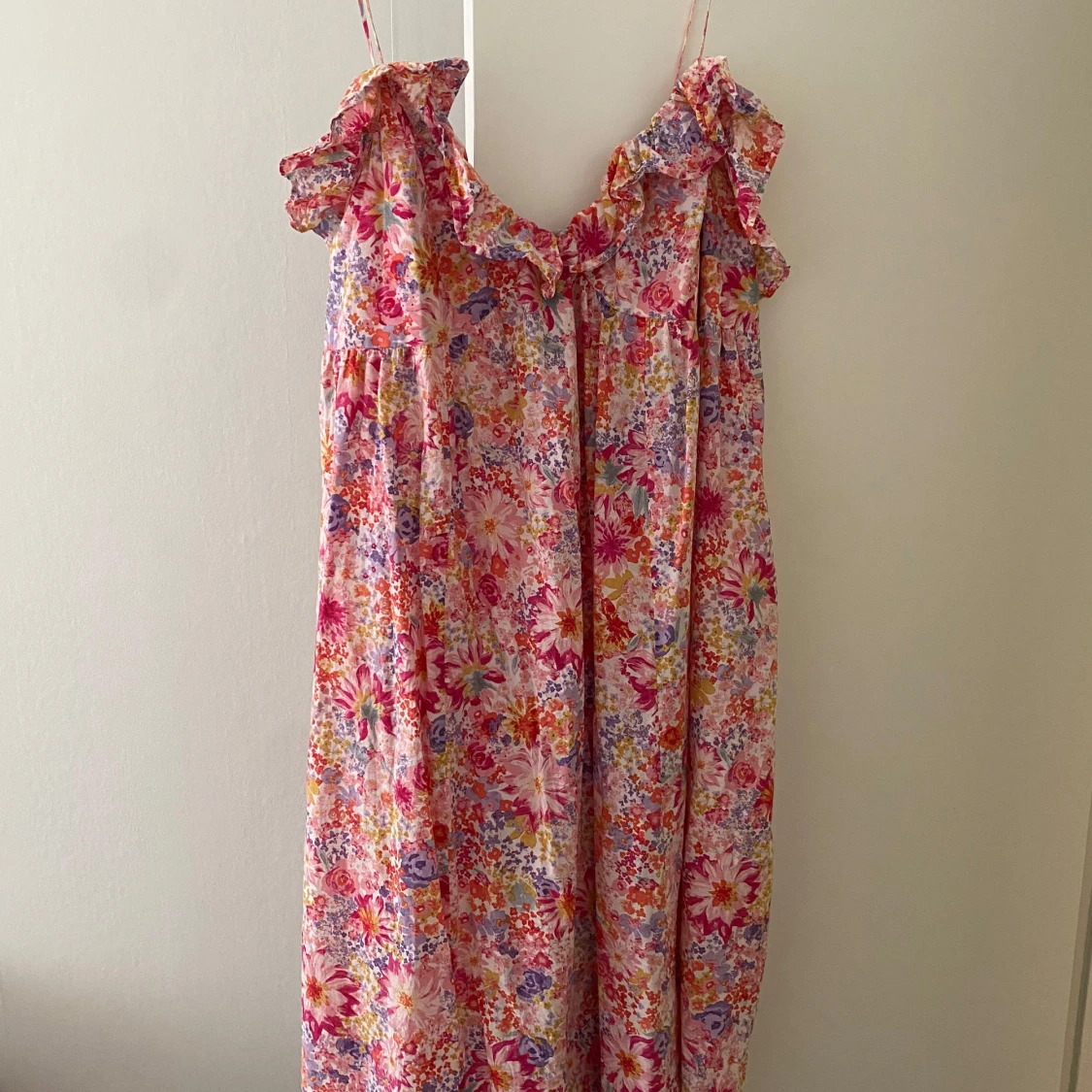 Superfin långklänning med färgglatt blommönster. Klänningen har smala axelband, volangdetaljer vid ringningen och en luftig, loose passform. Använts 2-3ggr.