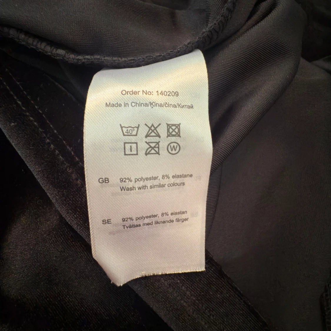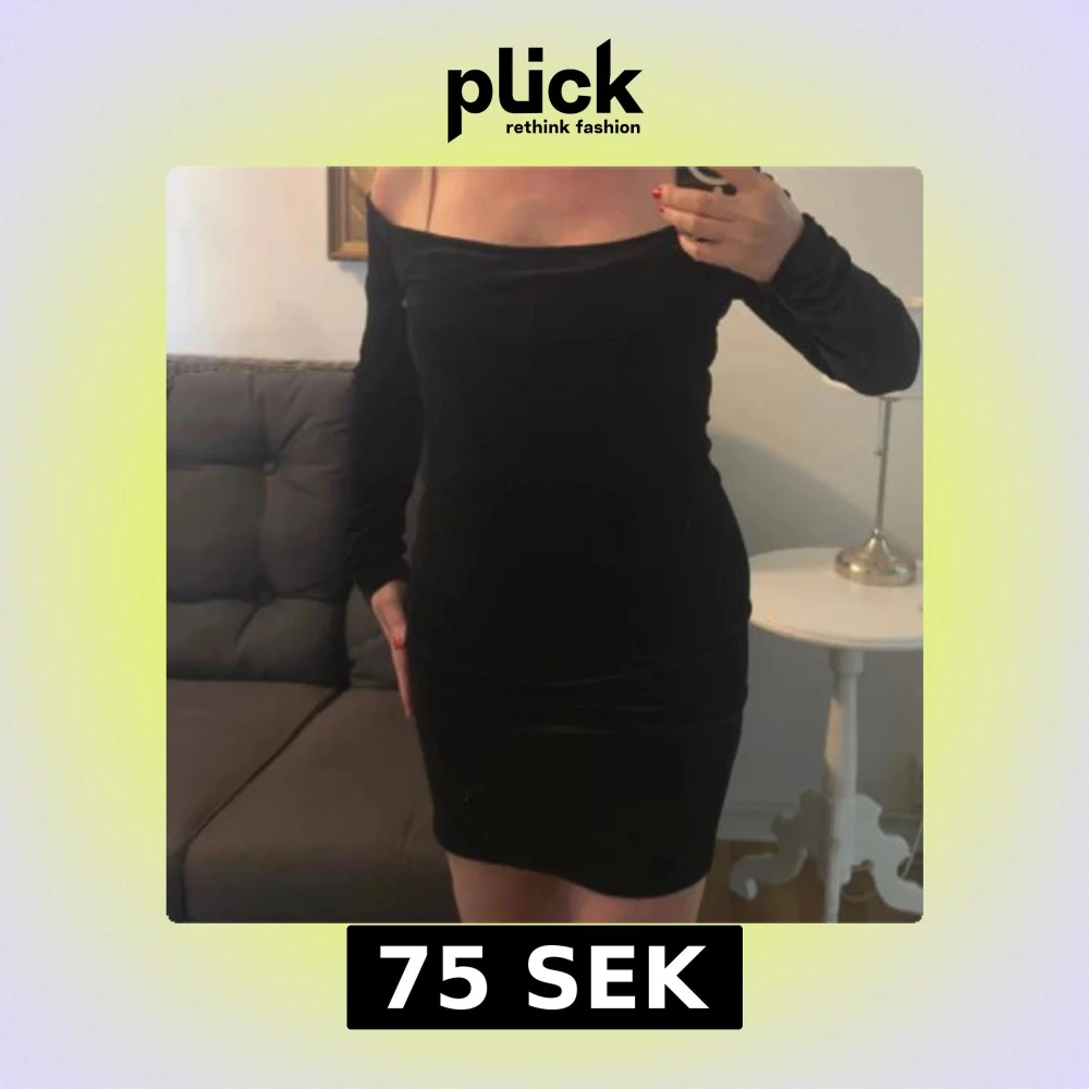 Svart sammetsklänning från 77thFLEA i storlek L. (Upplever att den passar bättre på en M). Klänningen har lång ärm, offshoulder-ringning och är kort i modellen. Materialet är mjuk och stretchig polyesterblandning som ger en snygg passform och lyxig känsla.