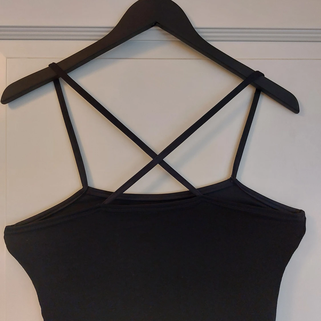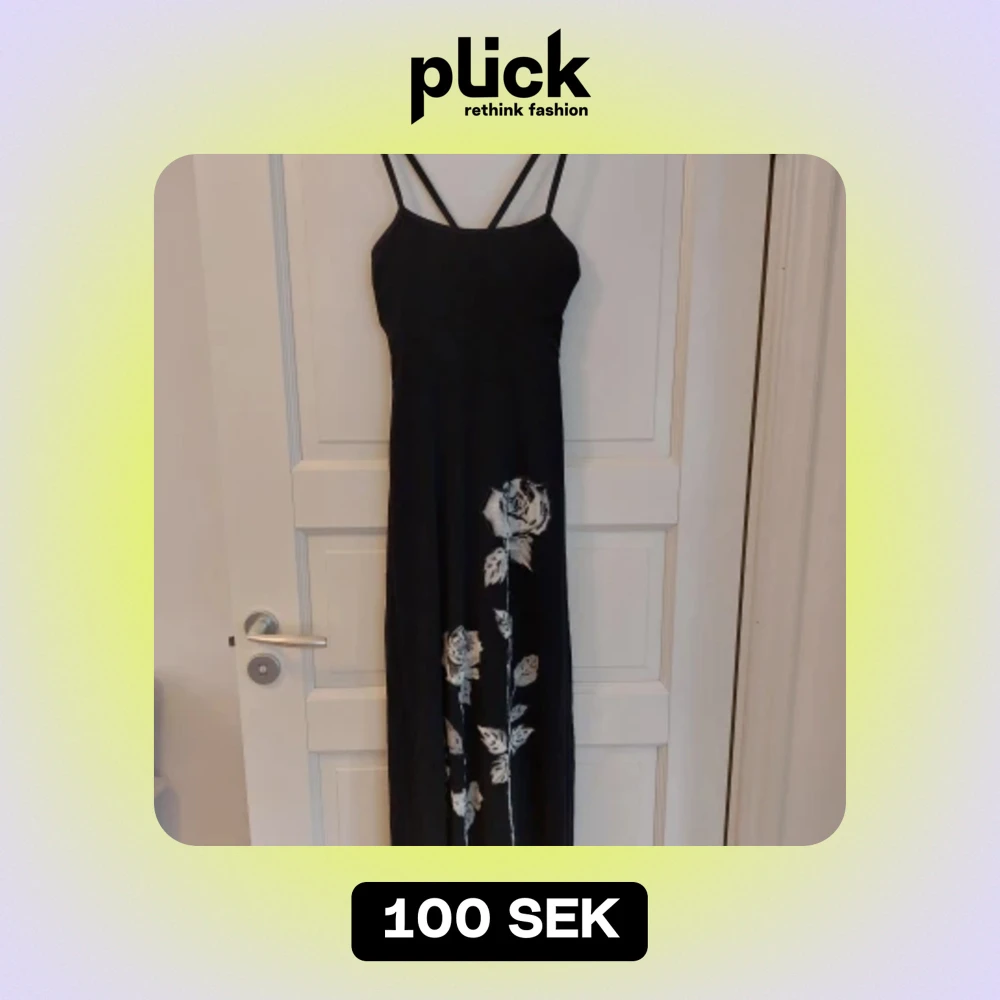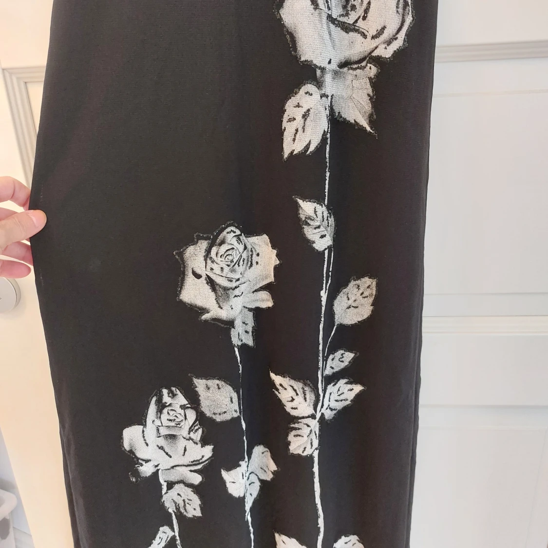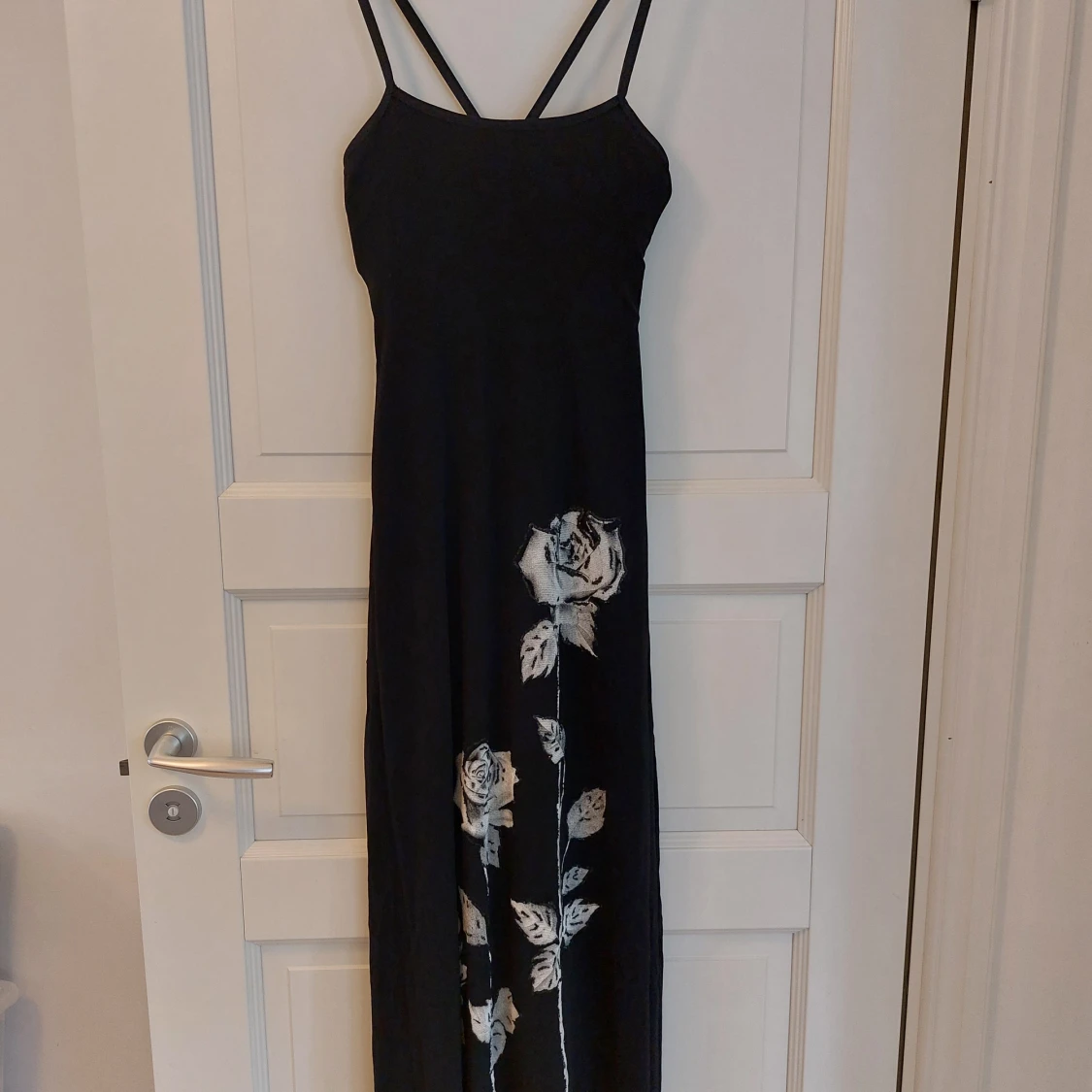Svart långklänning med tunna band som korsas i ryggen. Motiv av tre vita rosor i olika höjd, dessa har dekorationer av små paljetter/pärlor. Lapp bortklippt, okänt märke. Uppskattad storlek M / 40.