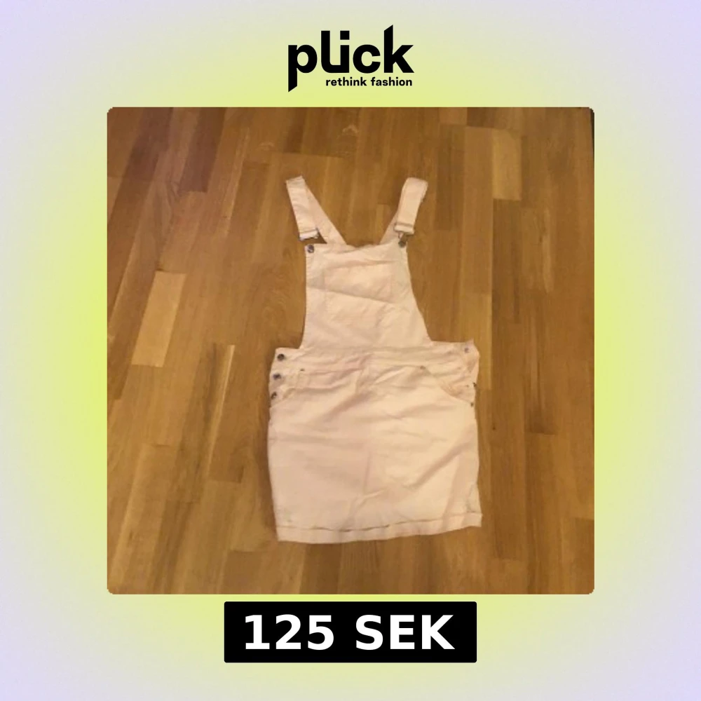 Säljer en ljusrosa hängselklänning med justerbara axelband och knappar i sidorna. Klänningen har fickor framtill och är i en kort modell. Perfekt för en avslappnad och trendig look.