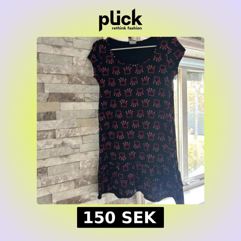 Svart kortklänning från me&i med rosa kronmönster över hela klänningen. Modellen har rund halsringning och korta ärmar. Tyget är mjukt och stretchigt, troligen i bomull eller polyester. Perfekt för dig som gillar lekfulla och unika prints.