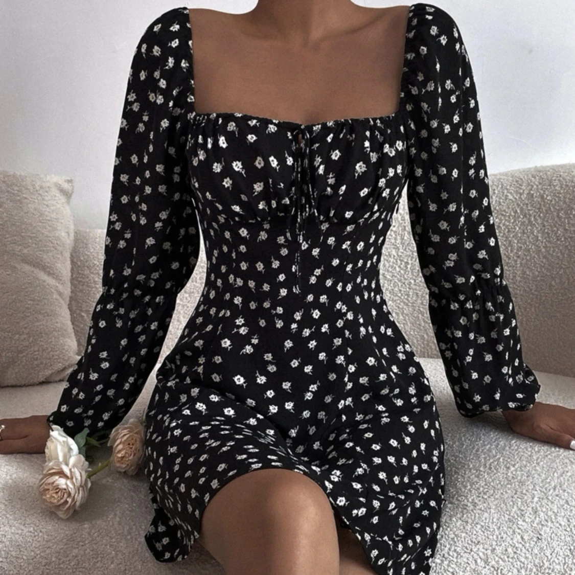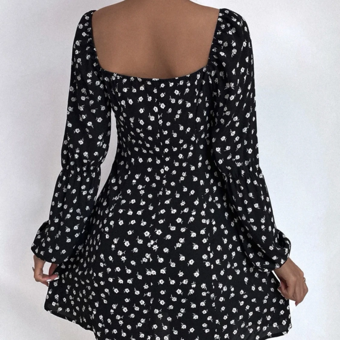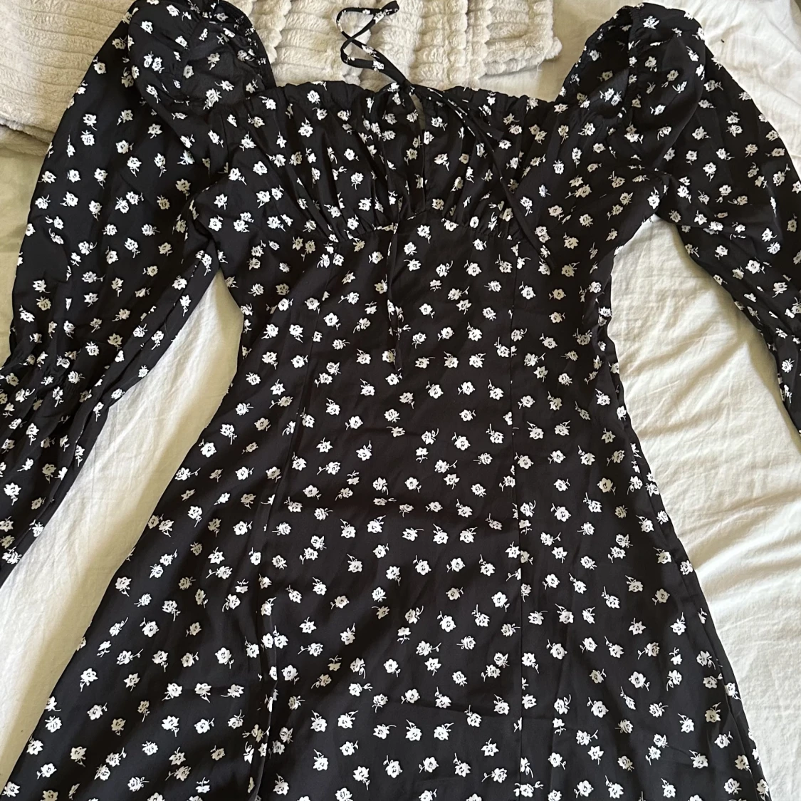 En svart fin klänning med vita blommor (se bild) super fin och finns inte att köpa samma sort längre!🤍 storlek M men skulle säga att den mer passar S