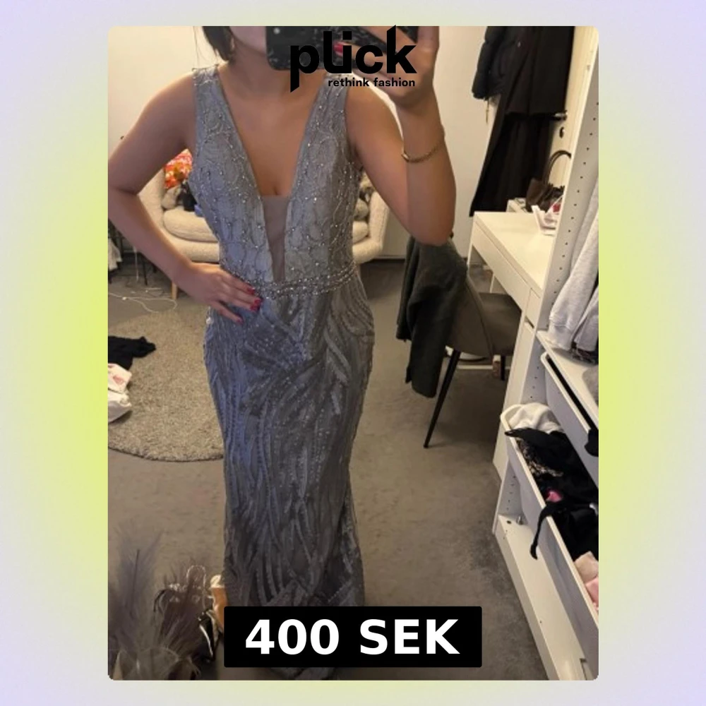 Säljer en elegant långklänning i silver med glittriga detaljer och pärlor. Klänningen har djup v-ringning fram och öppen rygg, samt ett mönster av glittriga pärlor och paljetter över hela tyget. Perfekt för speciella tillfällen och bal. Har tyvärr aldrig blivit använd då den är lite för stor, tygbiten där fram går även att klippa bort!