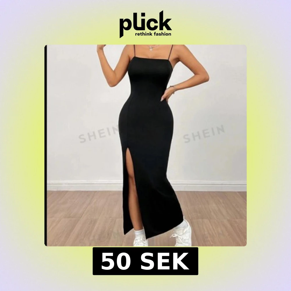 Elegant svart långklänning med smala axelband och en stilren slits framtill. Perfekt för en kväll ute eller en speciell tillställning. Klänningen har en figurnära passform som framhäver silhuetten.