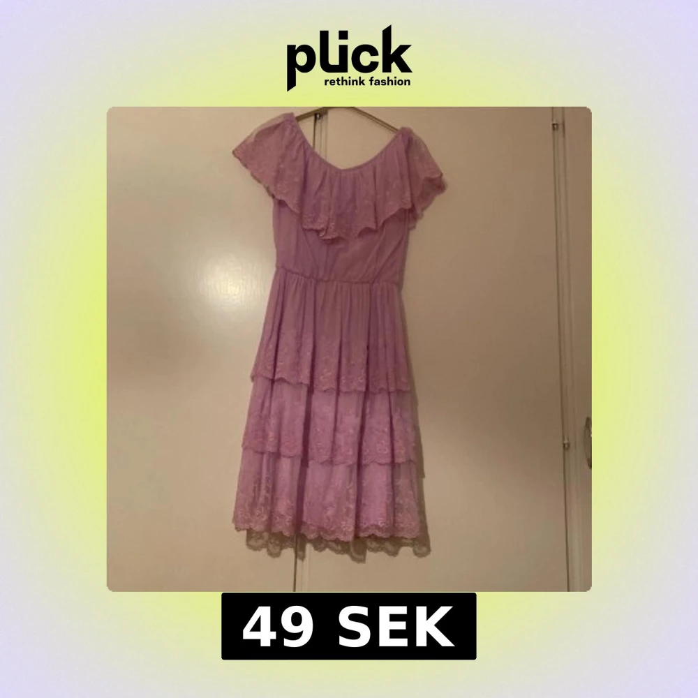 Söt ljuslila klänning med volanger och spetsdetaljer. Klänningen har offshoulder-skärning och flera lager volang i kjolen. Perfekt för sommarens tillfällen och har en romantisk känsla.