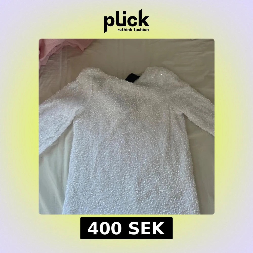 Säljer en elegant vit klänning med glittrande paljetter och en stor svart rosett baktill. Klänningen har full längd i armarna och en figurnära passform, perfekt för festliga tillfällen.