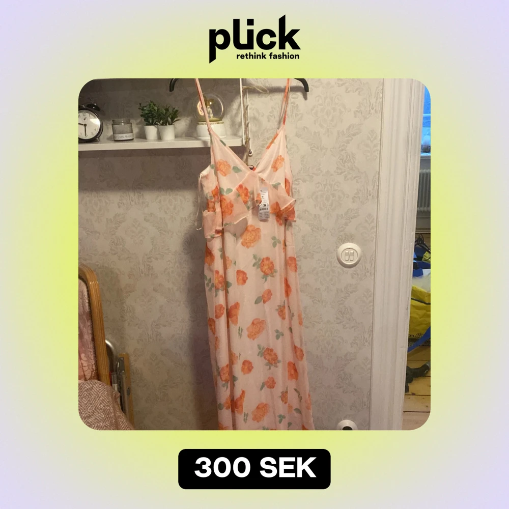Superfin långklänning i ljusrosa med stora blommor. Den har smala axelband och en v-ringad design med volangdetaljer framtill. Den är i storlek M, helt ny!🌸300+ frakt