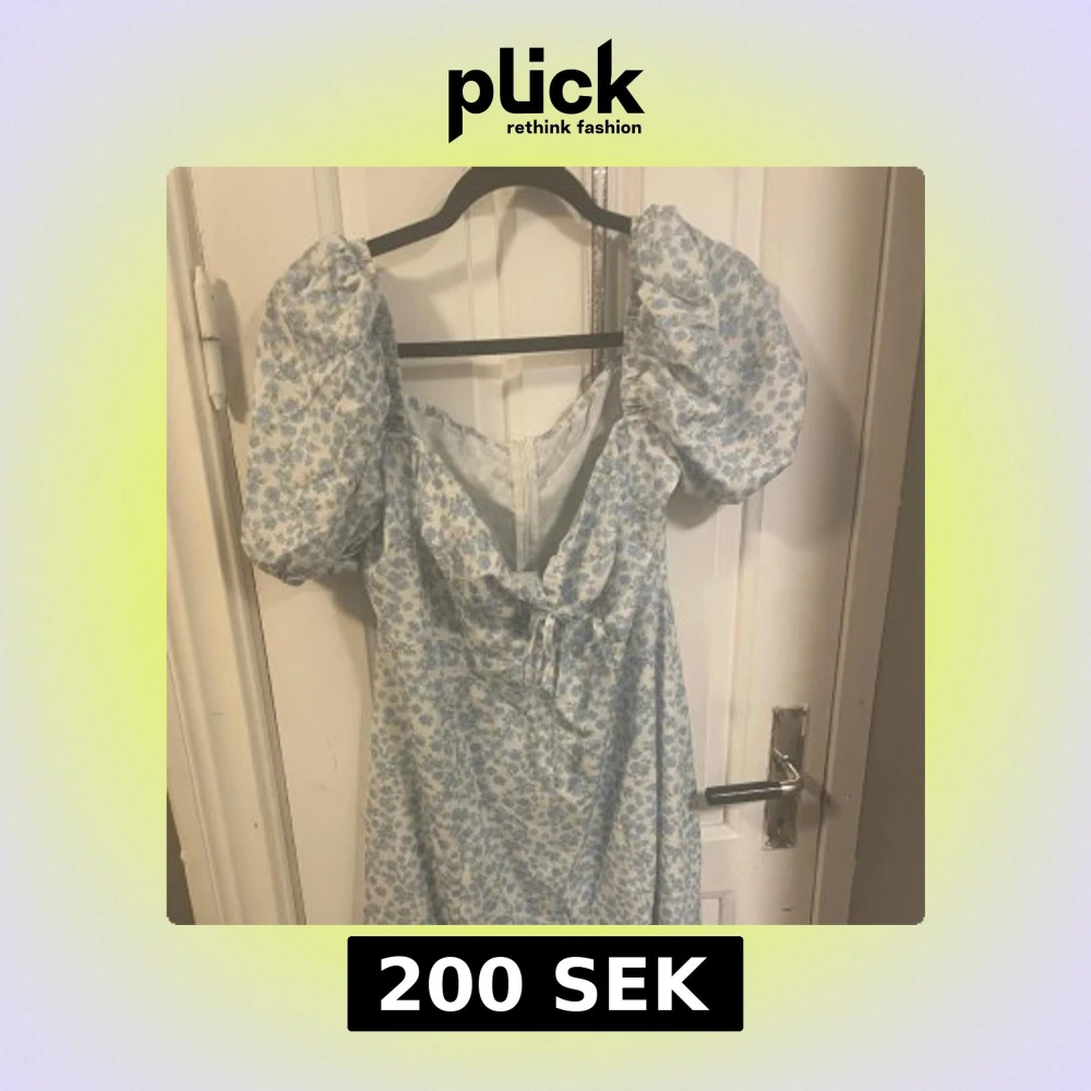 Charmig långklänning med blått blommönster på vit bakgrund. Klänningen har puffiga kortärmar och en söt knytning framtill. Perfekt för sommarens alla tillfällen!
